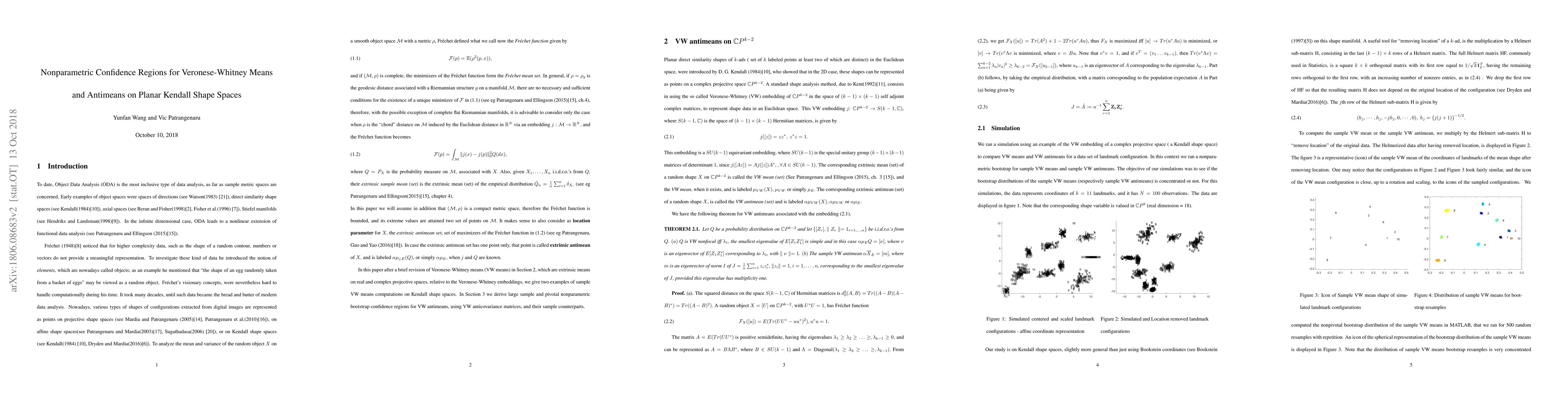 The paper discusses nonparametric bootstrap confidence regions for Veronese-Whitney (VW) antimeans on planar Kendall shape spaces, utilizing VW-anti-covariance matrices and their sample counterparts.