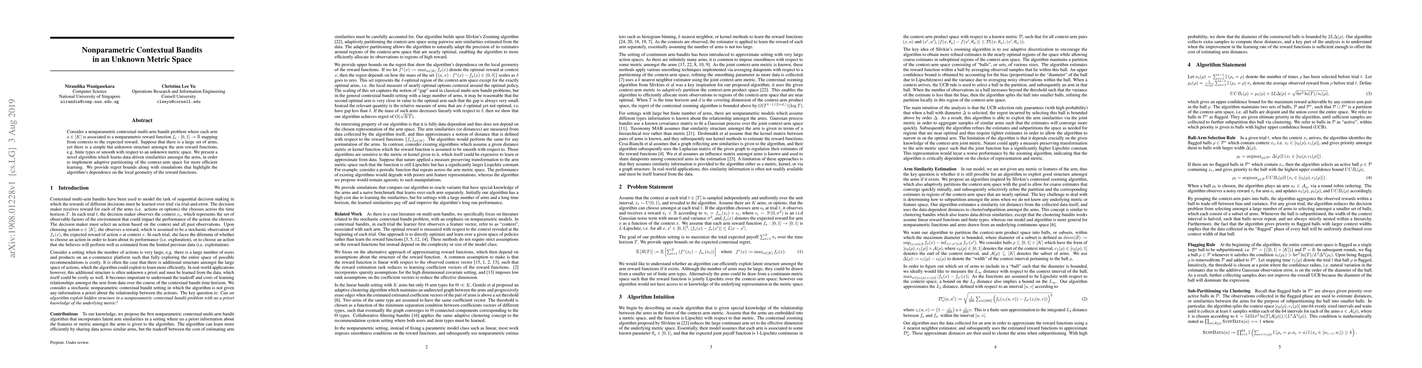 This research introduces a novel algorithm for nonparametric contextual bandit problems with unknown reward function structures, like finite types or smoothness in an unknown metric space. It learns data-driven similarities among arms for adaptive partitioning, providing regret bounds and highlighting dependence on reward function geometry through simulations.