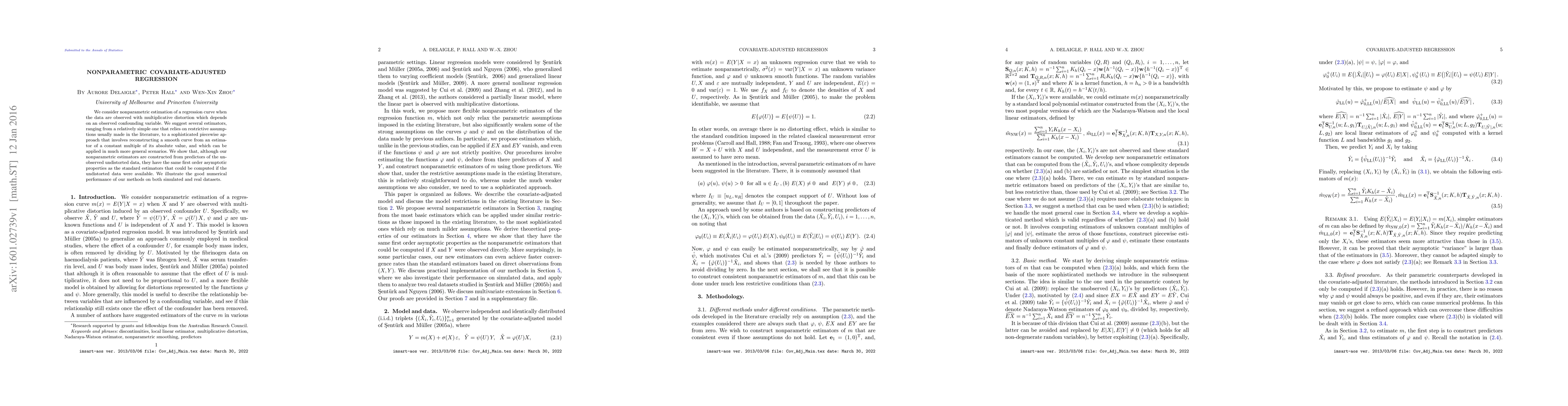We consider nonparametric estimation of a regression curve when the data are observed with multiplicative distortion which depends on an observed confounding variable. We suggest several estimators, ranging from a relatively simple one that relies on restrictive assumptions usually made in the literature, to a sophisticated piecewise approach that involves reconstructing a smooth curve from an estimator of a constant multiple of its absolute value, and which can be applied in much more general scenarios. We show that, although our nonparametric estimators are constructed from predictors of the unobserved undistorted data, they have the same first order asymptotic properties as the standard estimators that could be computed if the undistorted data were available. We illustrate the good numerical performance of our methods on both simulated and real datasets.