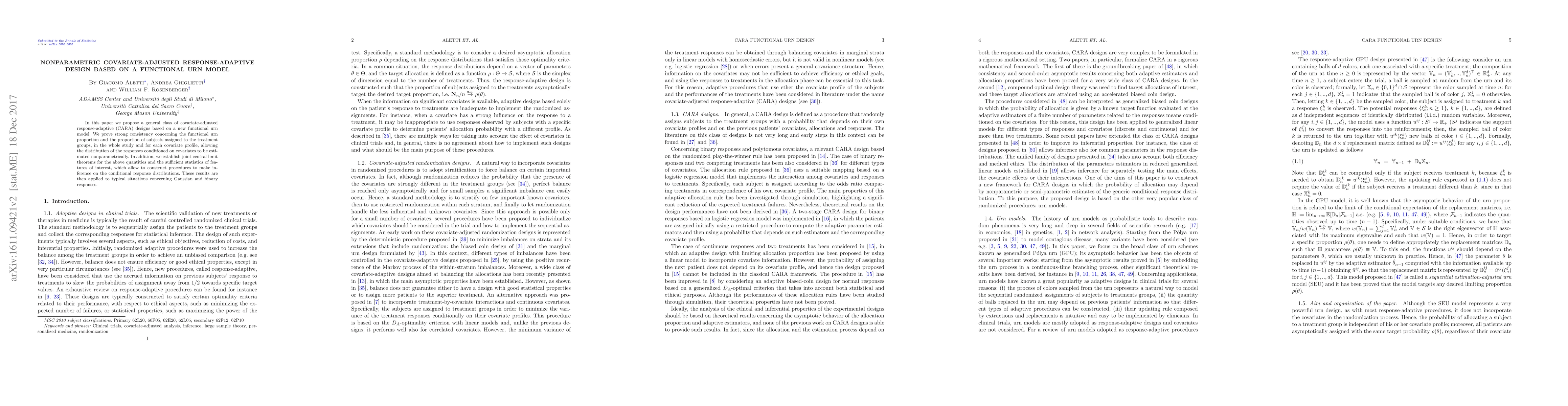 In this paper we propose a general class of covariate-adjusted response-adaptive (CARA) designs based on a new functional urn model. We prove strong consistency concerning the functional urn proportion and the proportion of subjects assigned to the treatment groups, in the whole study and for each covariate profile, allowing the distribution of the responses conditioned on covariates to be estimated nonparametrically. In addition, we establish joint central limit theorems for the above quantities and the sufficient statistics of features of interest, which allow to construct procedures to make inference on the conditional response distributions. These results are then applied to typical situations concerning Gaussian and binary responses.
