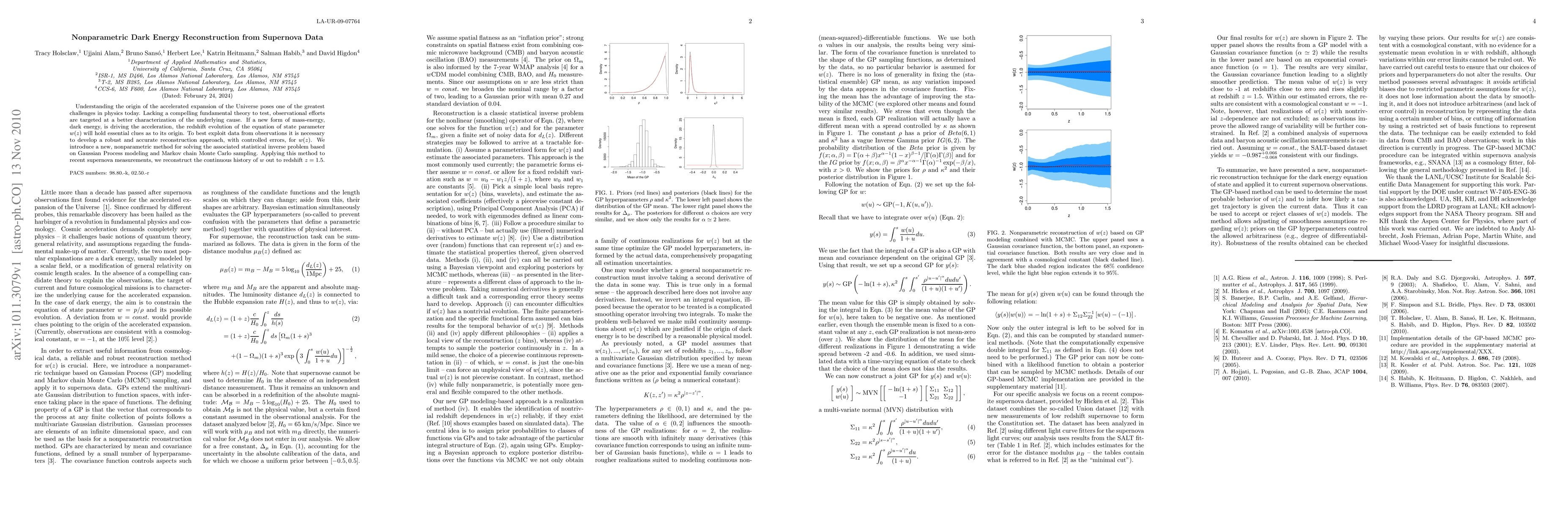 This paper introduces a nonparametric method using Gaussian Process modeling and Markov chain Monte Carlo sampling to reconstruct the dark energy equation of state parameter, w(z), from supernova data, providing a continuous history of w up to redshift z=1.5. This approach aims to better characterize the cause of the accelerated expansion of the Universe.