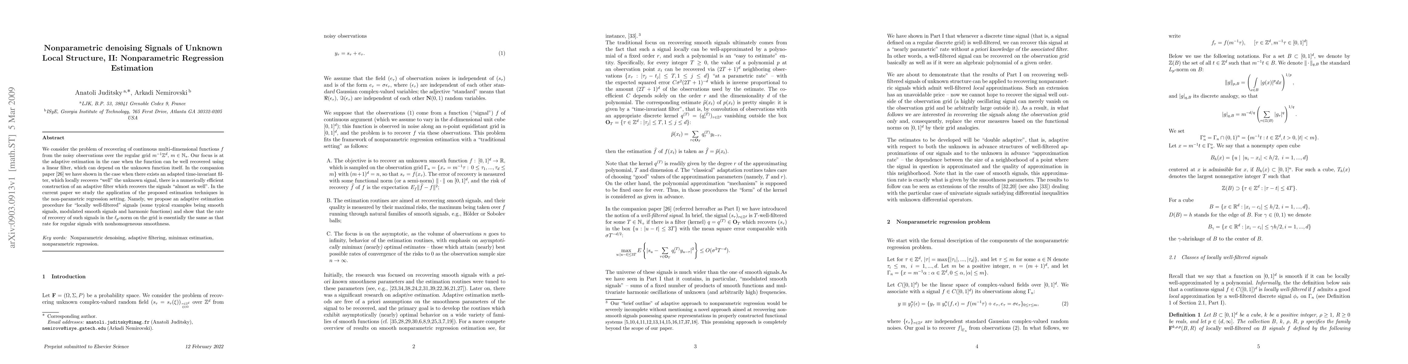We consider the problem of recovering of continuous multi-dimensional functions from the noisy observations over the regular grid. Our focus is at the adaptive estimation in the case when the function can be well recovered using a linear filter, which can depend on the unknown function itself. In the companion paper "Nonparametric Denoising of Signals with Unknown Local Structure, I: Oracle Inequalities" we have shown in the case when there exists an adapted time-invariant filter, which locally recovers "well" the unknown signal, there is a numerically efficient construction of an adaptive filter which recovers the signals "almost as well". In the current paper we study the application of the proposed estimation techniques in the non-parametric regression setting. Namely, we propose an adaptive estimation procedure for "locally well-filtered" signals (some typical examples being smooth signals, modulated smooth signals and harmonic functions) and show that the rate of recovery of such signals in the $\ell_p$-norm on the grid is essentially the same as that rate for regular signals with nonhomogeneous smoothness.