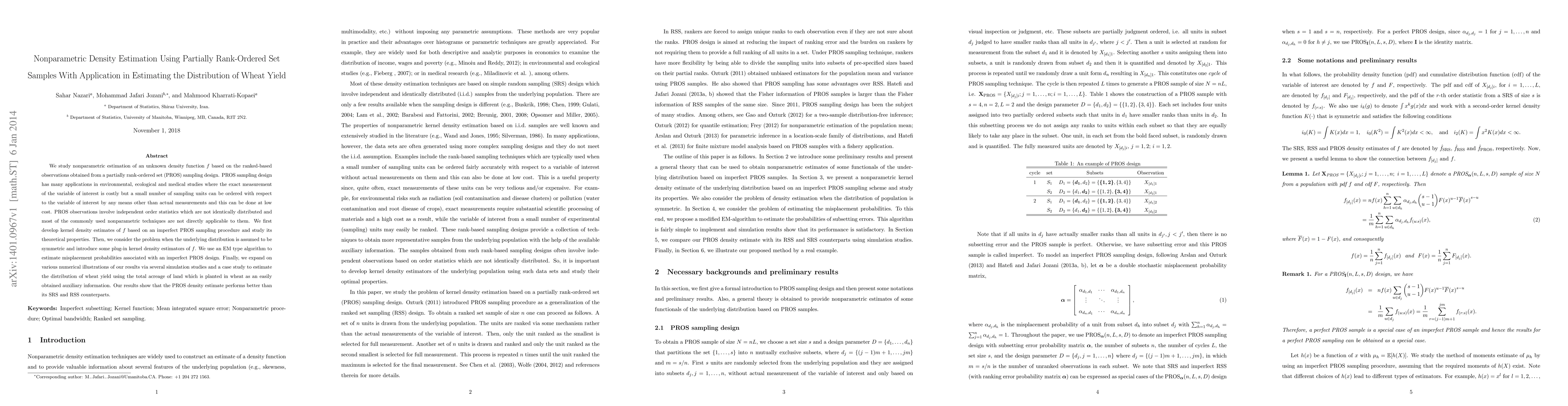 This paper develops nonparametric density estimation methods for partially rank-ordered set (PROS) samples, addressing the challenge of estimating an unknown density function from ranked observations where exact measurements are costly. It introduces kernel density estimators and an EM algorithm to handle imperfect PROS designs, demonstrating improved performance over simple random sampling methods through simulations and a case study estimating wheat yield distribution.