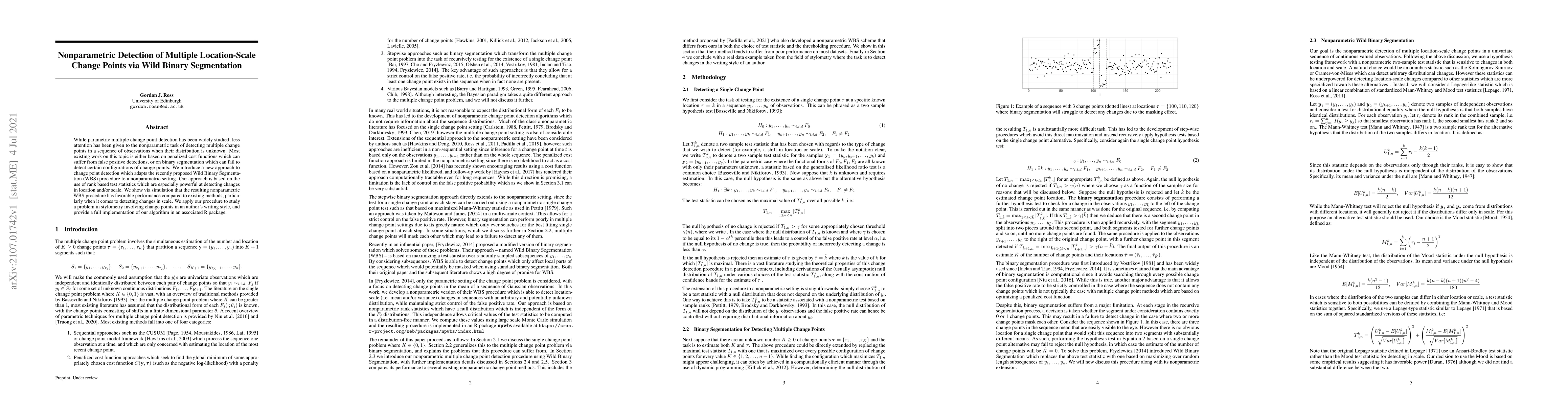 This paper introduces a nonparametric method for detecting multiple change points in observation sequences using an adapted Wild Binary Segmentation (WBS) approach with rank-based test statistics. The proposed method shows superior performance in detecting changes in location and scale compared to existing techniques, as demonstrated through simulations and an application in stylometry.