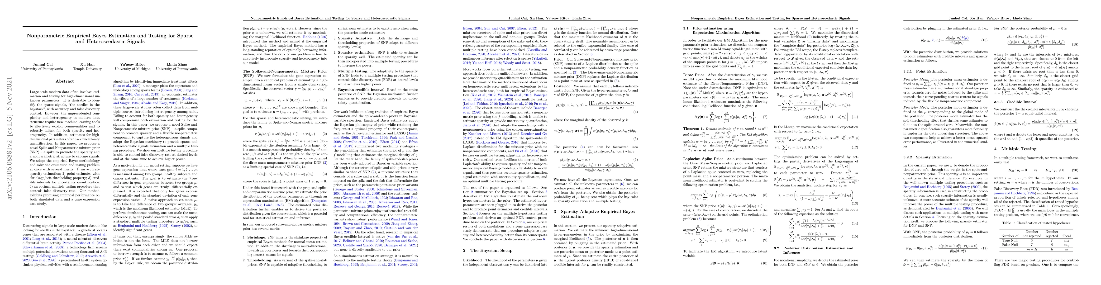 This paper introduces a novel Spike-and-Nonparametric mixture prior (SNP) for estimating and testing sparse, heteroscedastic signals in high-dimensional data. The proposed method provides accurate sparsity estimation, shrinkage point estimates, credible intervals for uncertainty, and an optimal multiple testing procedure for false discovery rate control.