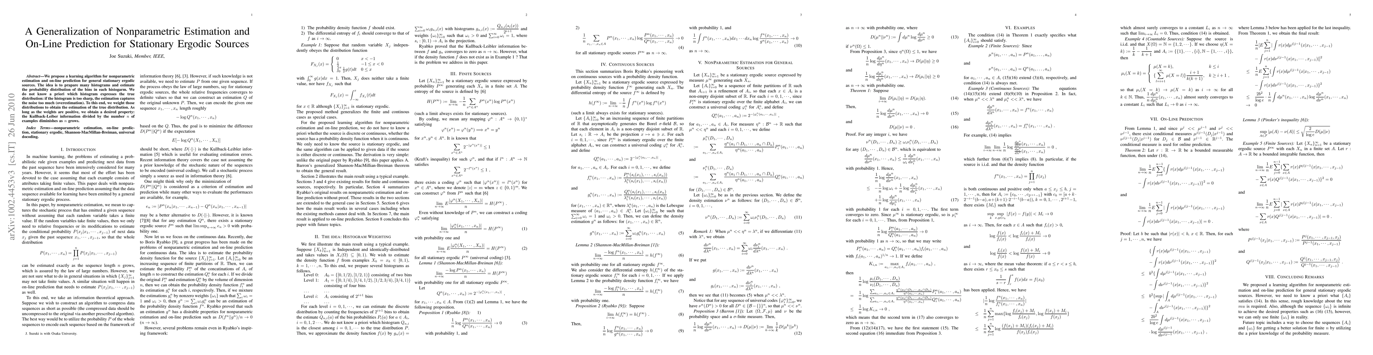 This paper proposes a nonparametric learning algorithm for estimating and predicting general stationary ergodic sources using histograms and mixture weights. The method is measure-theoretic, applicable to both discrete and continuous sources, and ensures convergence of the Kullback-Leibler information to zero as the sequence length increases, without requiring a probability density function for continuous sources.