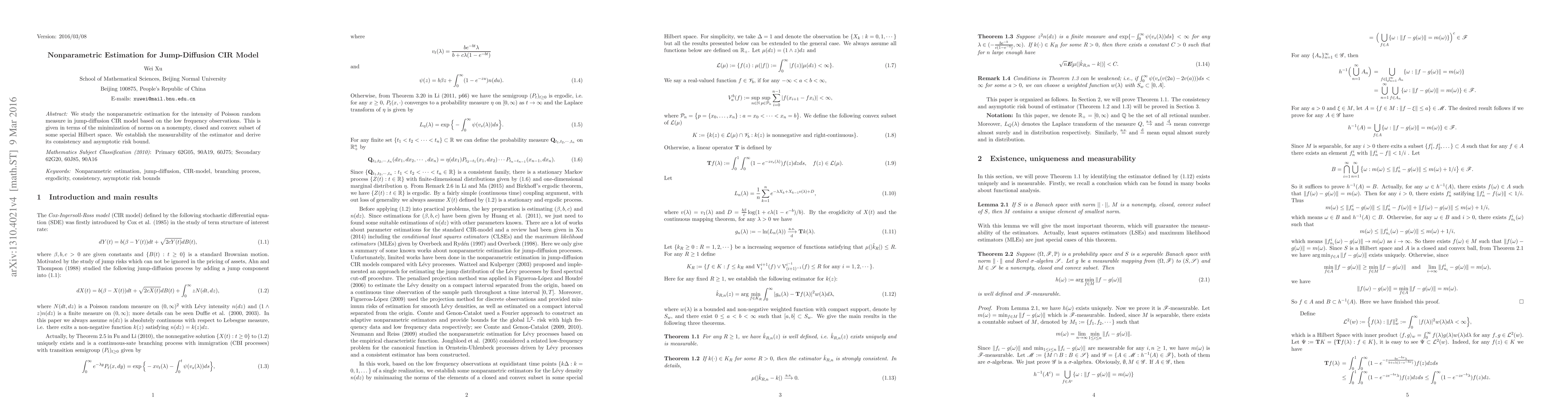 This paper investigates nonparametric estimation techniques for the intensity of Poisson random measures in a jump-diffusion Cox-Ingersoll-Ross (CIR) model using low frequency observations. It establishes the estimator's measurability and proves its consistency and asymptotic risk bounds.