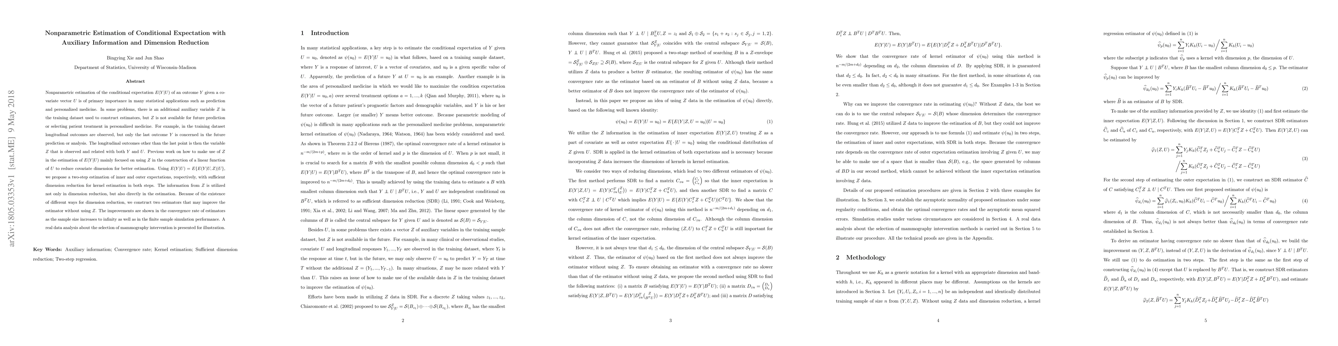 Nonparametric estimation of the conditional expectation $E(Y | U)$ of an outcome $Y$ given a covariate vector $U$ is of primary importance in many statistical applications such as prediction and personalized medicine. In some problems, there is an additional auxiliary variable $Z$ in the training dataset used to construct estimators, but $Z$ is not available for future prediction or selecting patient treatment in personalized medicine. For example, in the training dataset longitudinal outcomes are observed, but only the last outcome $Y$ is concerned in the future prediction or analysis. The longitudinal outcomes other than the last point is then the variable $Z$ that is observed and related with both $Y$ and $U$. Previous work on how to make use of $Z$ in the estimation of $E(Y|U)$ mainly focused on using $Z$ in the construction of a linear function of $U$ to reduce covariate dimension for better estimation. Using $E(Y|U) = E\{E(Y|U, Z)| U\}$, we propose a two-step estimation of inner and outer expectations, respectively, with sufficient dimension reduction for kernel estimation in both steps. The information from $Z$ is utilized not only in dimension reduction, but also directly in the estimation. Because of the existence of different ways for dimension reduction, we construct two estimators that may improve the estimator without using $Z$. The improvements are shown in the convergence rate of estimators as the sample size increases to infinity as well as in the finite sample simulation performance. A real data analysis about the selection of mammography intervention is presented for illustration.