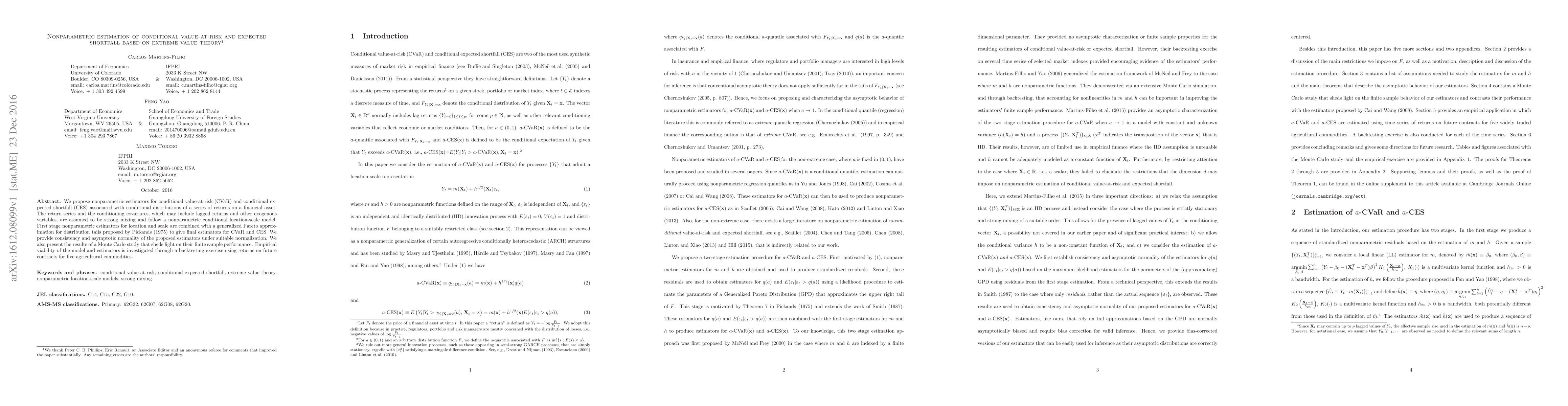 This paper proposes nonparametric estimators for conditional value-at-risk (CVaR) and conditional expected shortfall (CES) based on extreme value theory, combining location-scale estimators with a generalized Pareto approximation. The study demonstrates consistency and asymptotic normality of the estimators and evaluates their performance through a Monte Carlo simulation and empirical backtesting on agricultural commodity futures.