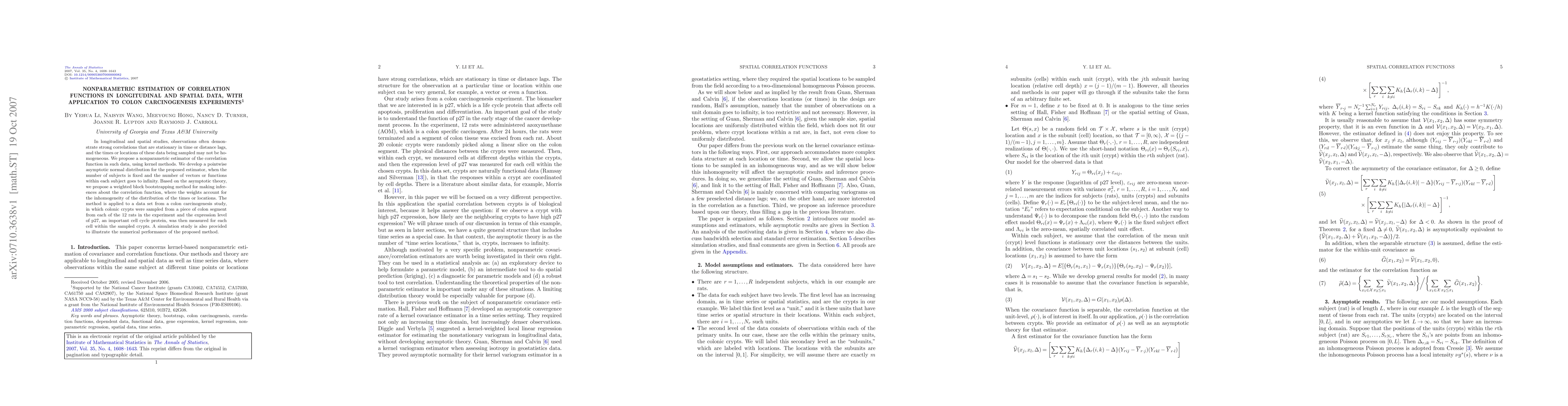 In longitudinal and spatial studies, observations often demonstrate strong correlations that are stationary in time or distance lags, and the times or locations of these data being sampled may not be homogeneous. We propose a nonparametric estimator of the correlation function in such data, using kernel methods. We develop a pointwise asymptotic normal distribution for the proposed estimator, when the number of subjects is fixed and the number of vectors or functions within each subject goes to infinity. Based on the asymptotic theory, we propose a weighted block bootstrapping method for making inferences about the correlation function, where the weights account for the inhomogeneity of the distribution of the times or locations. The method is applied to a data set from a colon carcinogenesis study, in which colonic crypts were sampled from a piece of colon segment from each of the 12 rats in the experiment and the expression level of p27, an important cell cycle protein, was then measured for each cell within the sampled crypts. A simulation study is also provided to illustrate the numerical performance of the proposed method.