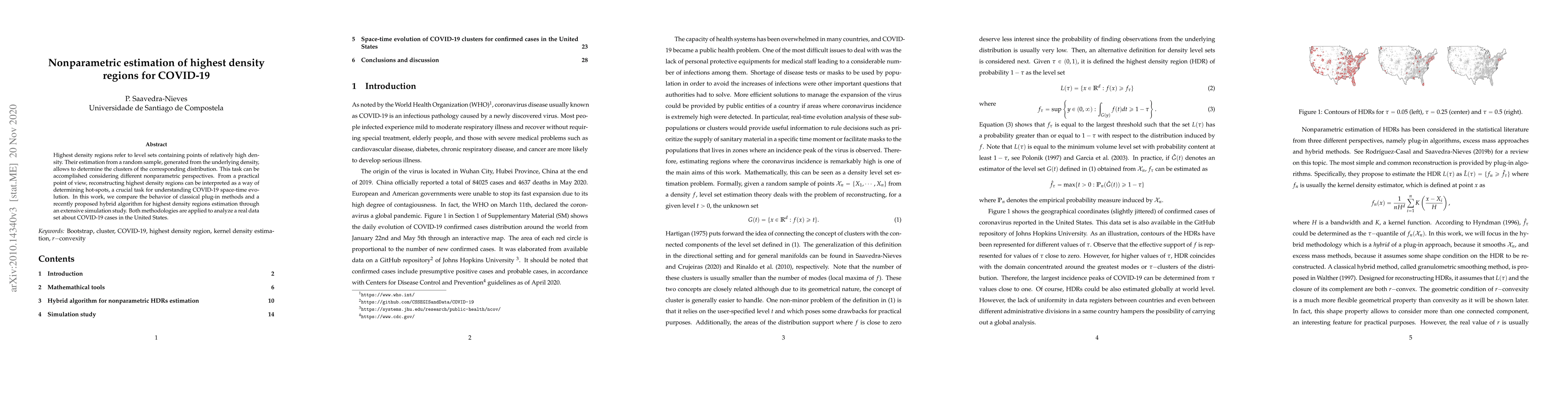 Highest density regions refer to level sets containing points of relatively high density. Their estimation from a random sample, generated from the underlying density, allows to determine the clusters of the corresponding distribution. This task can be accomplished considering different nonparametric perspectives. From a practical point of view, reconstructing highest density regions can be interpreted as a way of determining hot-spots, a crucial task for understanding COVID-19 space-time evolution. In this work, we compare the behavior of classical plug-in methods and a recently proposed hybrid algorithm for highest density regions estimation through an extensive simulation study. Both methodologies are applied to analyze a real data set about COVID-19 cases in the United States.