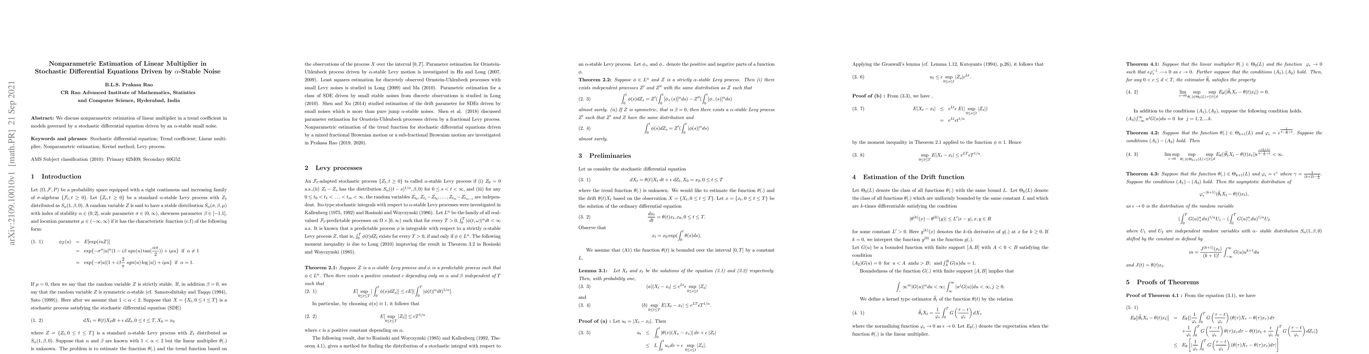 Summary: This paper explores nonparametric methods for estimating the linear multiplier in trend coefficients in stochastic differential equations influenced by $\alpha$-stable noise, focusing on developing robust estimation techniques for such complex models.