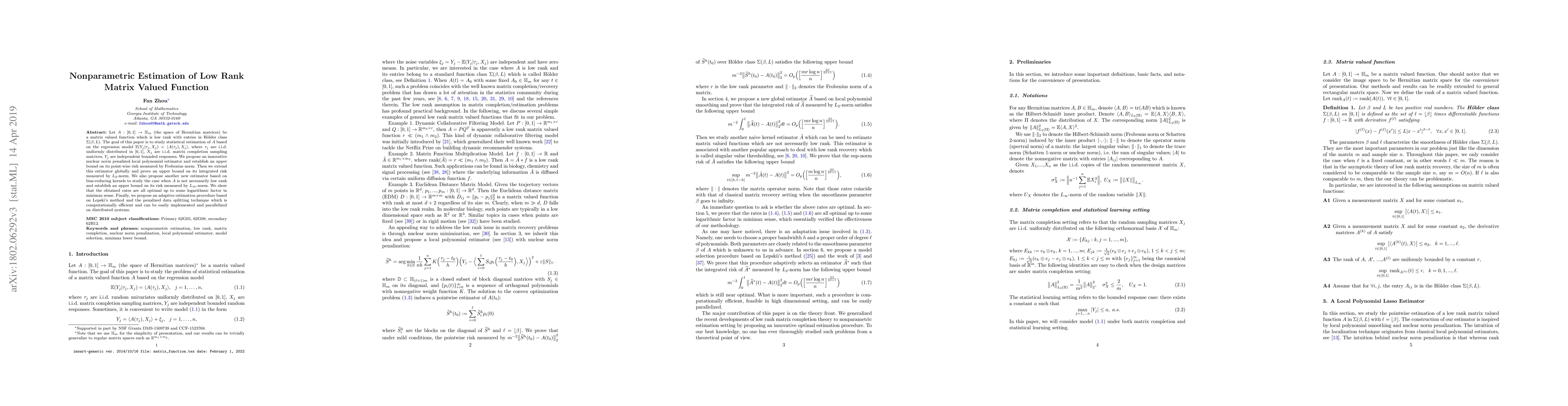 Let $A:[0,1]\rightarrow\mathbb{H}_m$ (the space of Hermitian matrices) be a matrix valued function which is low rank with entries in H\"{o}lder class $\Sigma(\beta,L)$. The goal of this paper is to study statistical estimation of $A$ based on the regression model $\mathbb{E}(Y_j|\tau_j,X_j) = \langle A(\tau_j), X_j \rangle,$ where $\tau_j$ are i.i.d. uniformly distributed in $[0,1]$, $X_j$ are i.i.d. matrix completion sampling matrices, $Y_j$ are independent bounded responses. We propose an innovative nuclear norm penalized local polynomial estimator and establish an upper bound on its point-wise risk measured by Frobenius norm. Then we extend this estimator globally and prove an upper bound on its integrated risk measured by $L_2$-norm. We also propose another new estimator based on bias-reducing kernels to study the case when $A$ is not necessarily low rank and establish an upper bound on its risk measured by $L_{\infty}$-norm. We show that the obtained rates are all optimal up to some logarithmic factor in minimax sense. Finally, we propose an adaptive estimation procedure based on Lepskii's method and model selection with data splitting which is computationally efficient and can be easily implemented and parallelized.