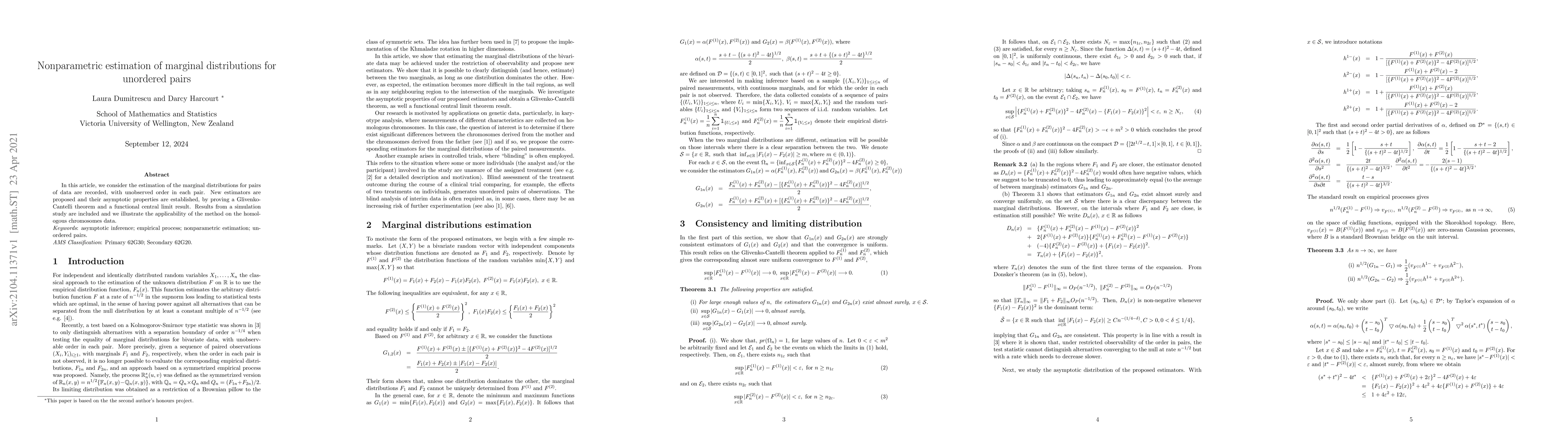 In this article, we consider the estimation of the marginal distributions for pairs of data are recorded, with unobserved order in each pair. New estimators are proposed and their asymptotic properties are established, by proving a Glivenko-Cantelli theorem and a functional central limit result. Results from a simulation study are included and we illustrate the applicability of the method on the homologous chromosomes data.