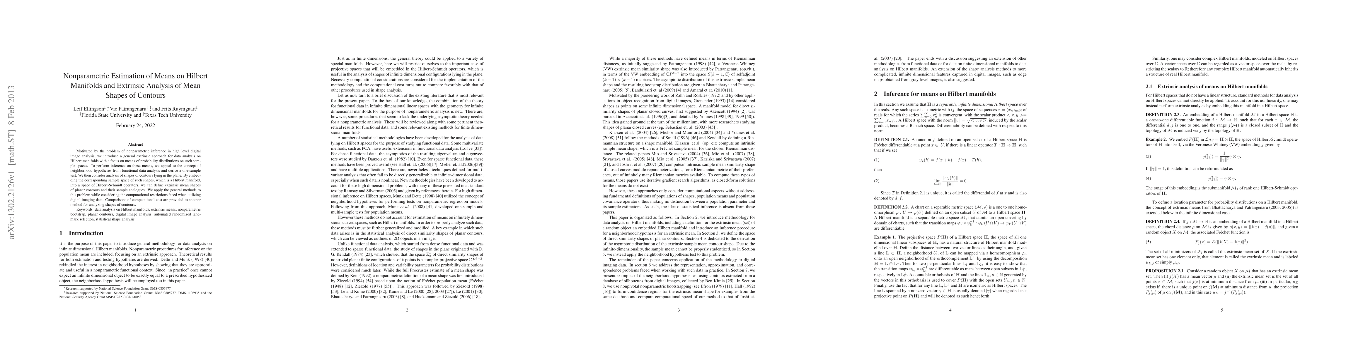 This paper introduces an extrinsic approach for nonparametric inference on means of probability distributions on Hilbert manifolds, applying it to analyze mean shapes of planar contours in digital image analysis. It derives a one-sample test and compares computational costs with alternative contour shape analysis methods.