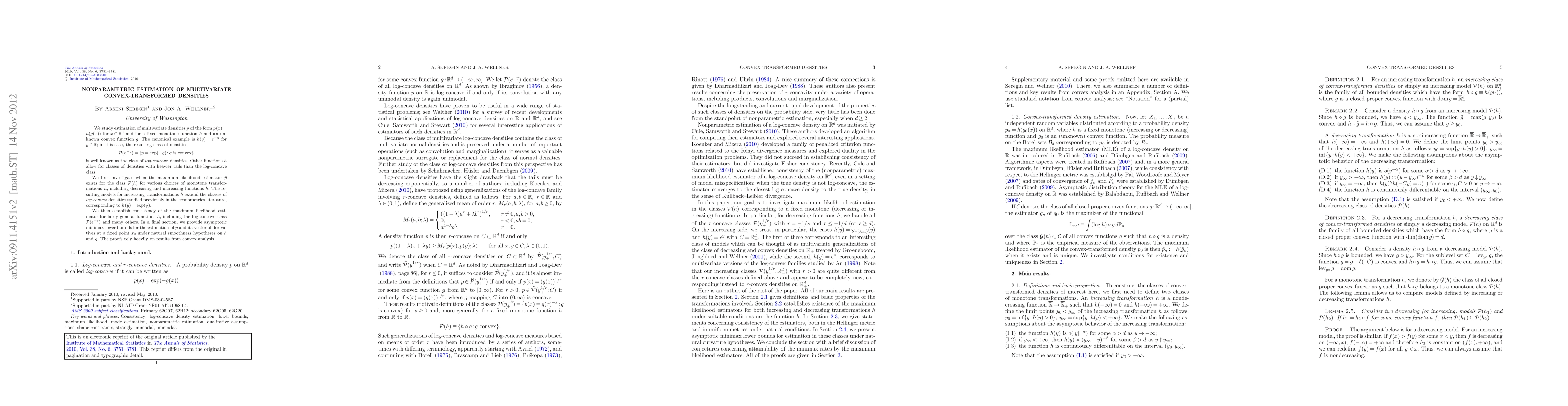 We study estimation of multivariate densities $p$ of the form $p(x)=h(g(x))$ for $x\in \mathbb {R}^d$ and for a fixed monotone function $h$ and an unknown convex function $g$. The canonical example is $h(y)=e^{-y}$ for $y\in \mathbb {R}$; in this case, the resulting class of densities [\mathcal {P}(e^{-y})={p=\exp(-g):g is convex}] is well known as the class of log-concave densities. Other functions $h$ allow for classes of densities with heavier tails than the log-concave class. We first investigate when the maximum likelihood estimator $\hat{p}$ exists for the class $\mathcal {P}(h)$ for various choices of monotone transformations $h$, including decreasing and increasing functions $h$. The resulting models for increasing transformations $h$ extend the classes of log-convex densities studied previously in the econometrics literature, corresponding to $h(y)=\exp(y)$. We then establish consistency of the maximum likelihood estimator for fairly general functions $h$, including the log-concave class $\mathcal {P}(e^{-y})$ and many others. In a final section, we provide asymptotic minimax lower bounds for the estimation of $p$ and its vector of derivatives at a fixed point $x_0$ under natural smoothness hypotheses on $h$ and $g$. The proofs rely heavily on results from convex analysis.