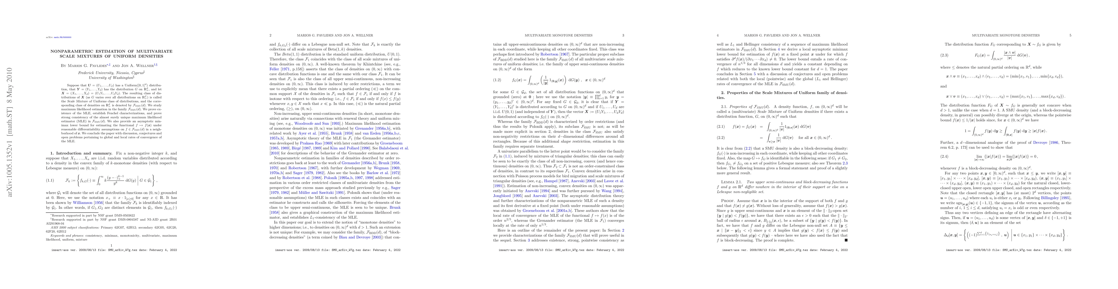 This paper studies nonparametric maximum likelihood estimation for multivariate scale mixtures of uniform distributions, proving existence, consistency, and asymptotic properties of the maximum likelihood estimator. It also provides an asymptotic minimax lower bound for estimating functionals within this class.