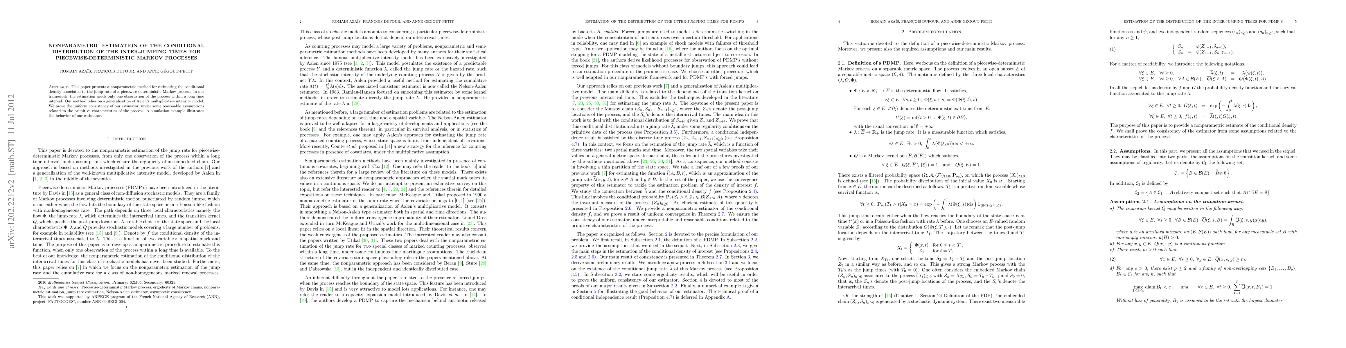 This paper introduces a nonparametric method for estimating the conditional density of inter-jumping times in piecewise-deterministic Markov processes, relying on a single observation over a long interval and generalizing Aalen's multiplicative intensity model. The method's uniform consistency is proven under reasonable assumptions, and a simulation example demonstrates its effectiveness.