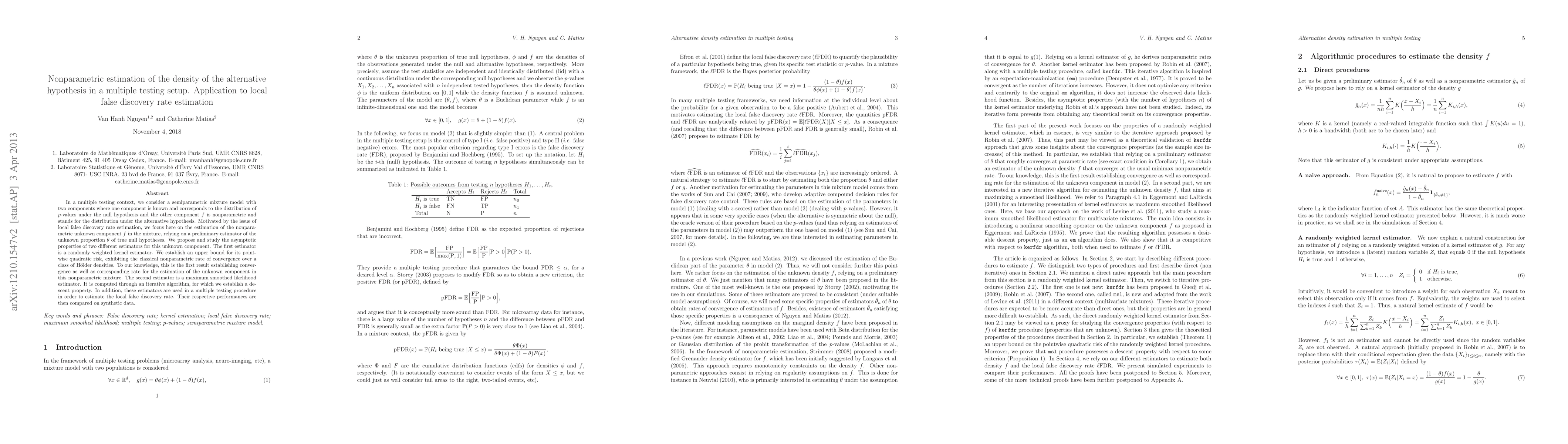 This paper proposes two estimators for nonparametrically estimating the alternative hypothesis density in a multiple testing framework, focusing on local false discovery rate estimation. The first is a randomly weighted kernel estimator, while the second is a maximum smoothed likelihood estimator, both analyzed for their asymptotic properties and performance on synthetic data.