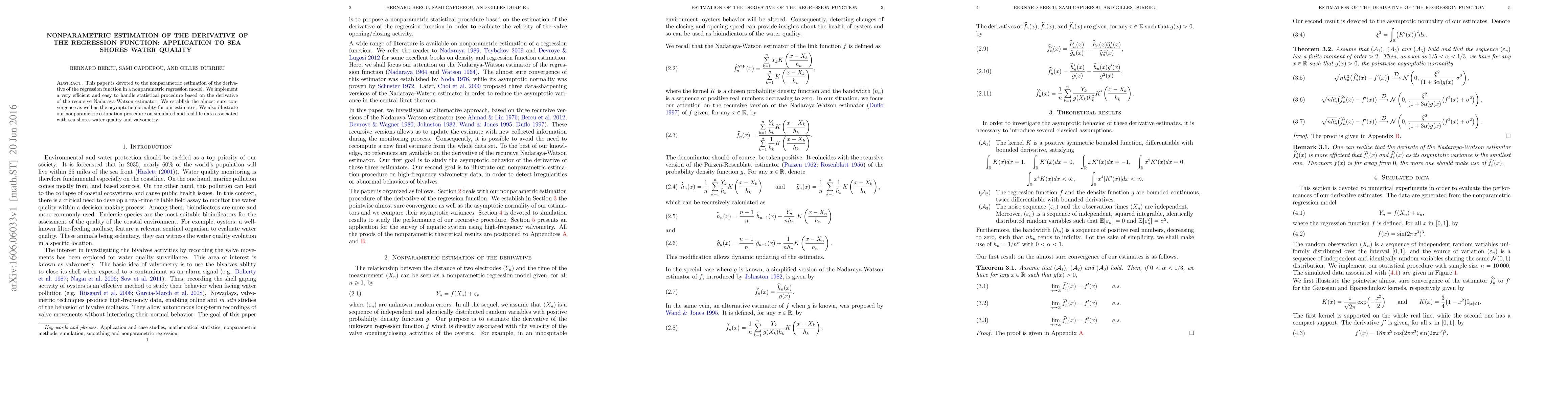 This paper is devoted to the nonparametric estimation of the derivative of the regression function in a nonparametric regression model. We implement a very efficient and easy to handle statistical procedure based on the derivative of the recursive Nadaraya-Watson estimator. We establish the almost sure convergence as well as the asymptotic normality for our estimates. We also illustrate our nonparametric estimation procedure on simulated and real life data associated with sea shores water quality and valvometry.