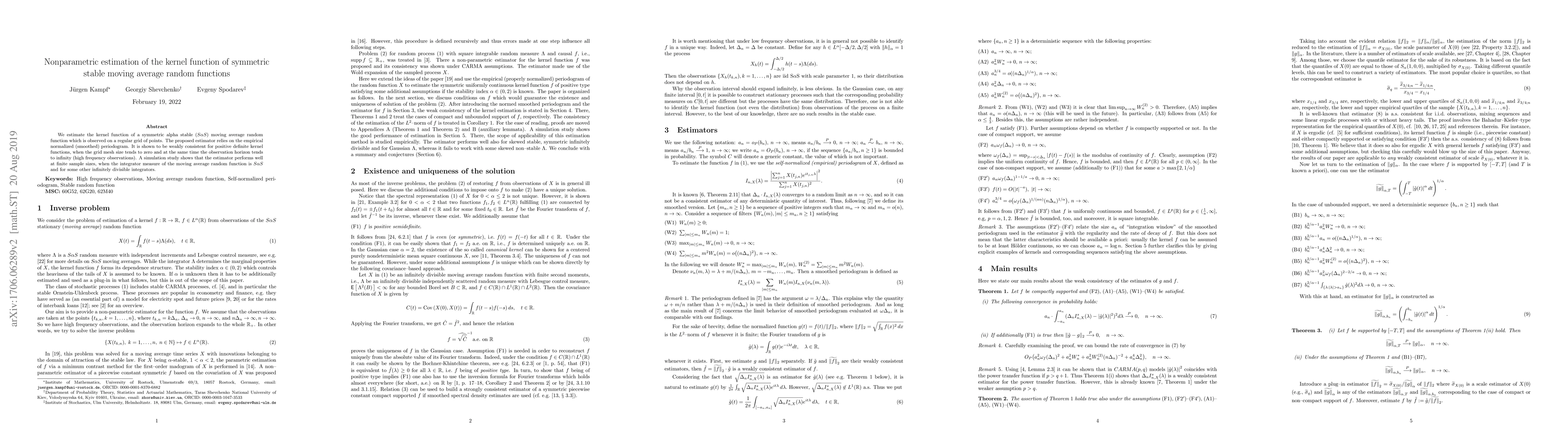 We estimate the kernel function of a symmetric alpha stable ($S\alpha S$) moving average random function which is observed on a regular grid of points. The proposed estimator relies on the empirical normalized (smoothed) periodogram. It is shown to be weakly consistent for positive definite kernel functions, when the grid mesh size tends to zero and at the same time the observation horizon tends to infinity (high frequency observations). A simulation study shows that the estimator performs well at finite sample sizes, when the integrator measure of the moving average random function is $S\alpha S$ and for some other infinitely divisible integrators.