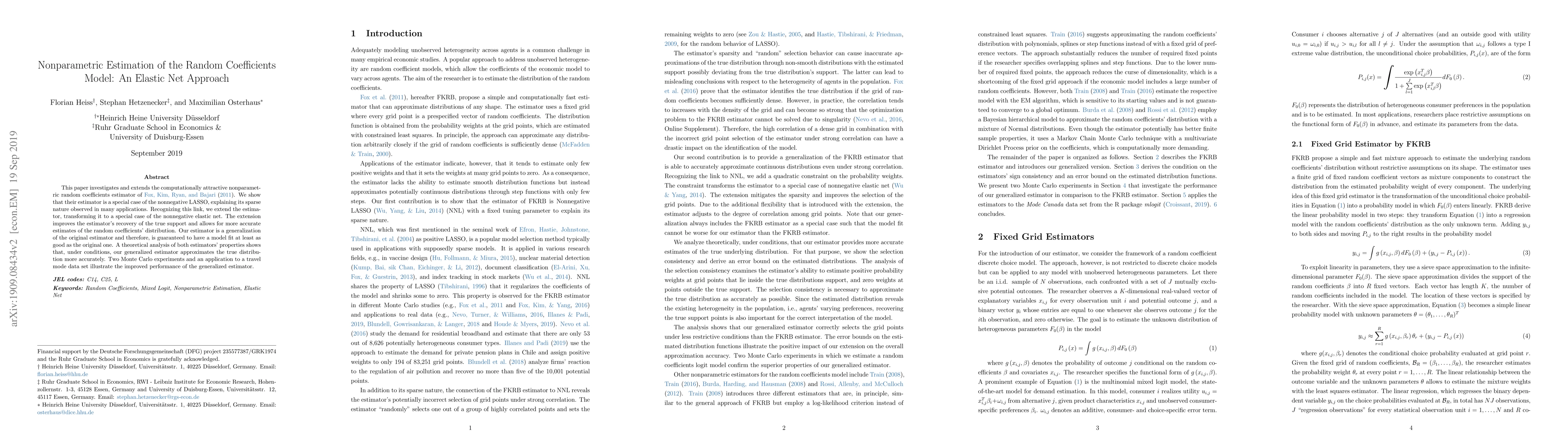 This paper investigates and extends the computationally attractive nonparametric random coefficients estimator of Fox, Kim, Ryan, and Bajari (2011). We show that their estimator is a special case of the nonnegative LASSO, explaining its sparse nature observed in many applications. Recognizing this link, we extend the estimator, transforming it to a special case of the nonnegative elastic net. The extension improves the estimator's recovery of the true support and allows for more accurate estimates of the random coefficients' distribution. Our estimator is a generalization of the original estimator and therefore, is guaranteed to have a model fit at least as good as the original one. A theoretical analysis of both estimators' properties shows that, under conditions, our generalized estimator approximates the true distribution more accurately. Two Monte Carlo experiments and an application to a travel mode data set illustrate the improved performance of the generalized estimator.