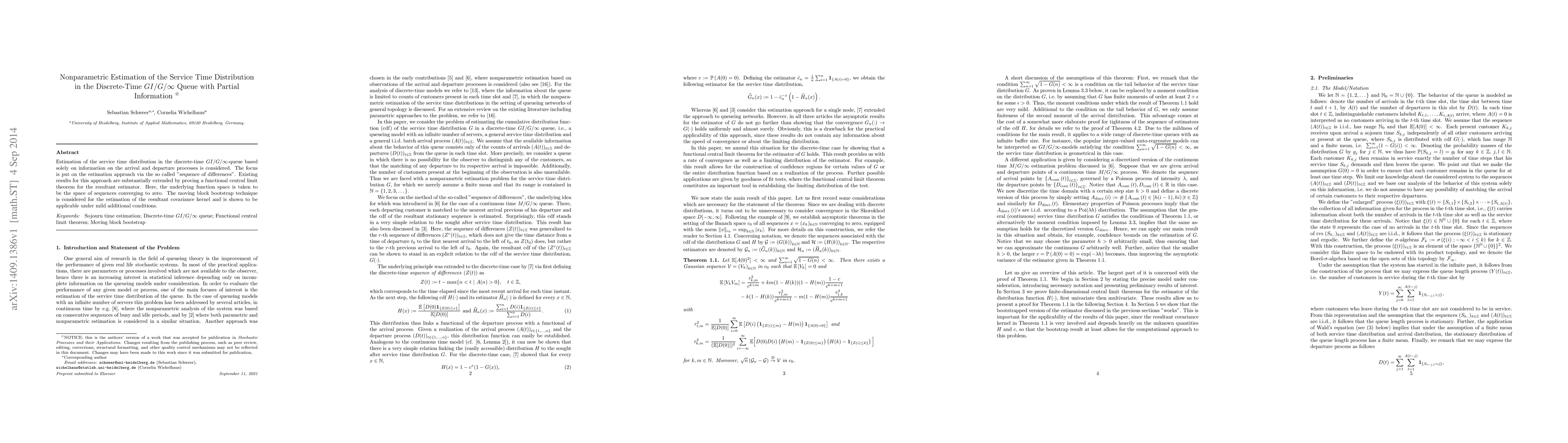 This paper develops a nonparametric method for estimating the service time distribution in a discrete-time $GI/G/\infty$ queue using only arrival and departure data. It extends existing "sequence of differences" techniques by proving a functional central limit theorem and applies the moving block bootstrap method to estimate the covariance kernel under mild conditions.