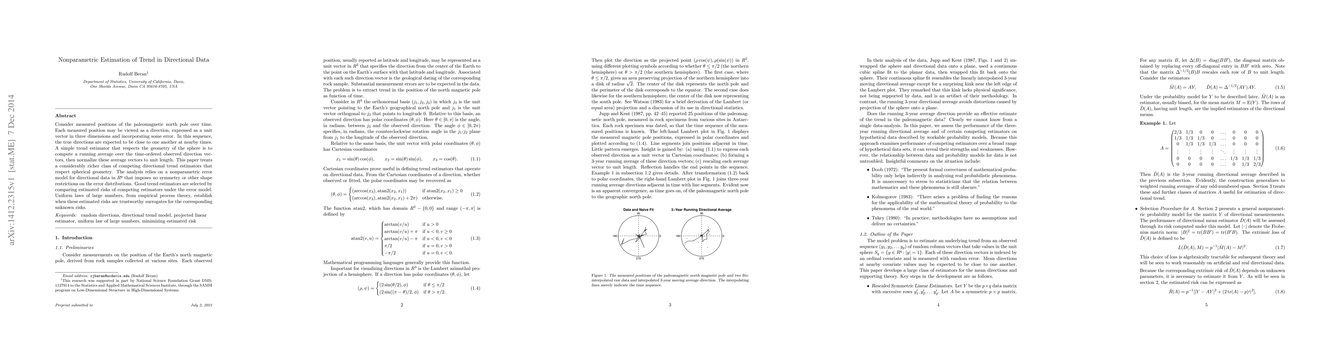 This paper develops nonparametric estimators for trends in directional data, specifically paleomagnetic north pole positions, using a running average approach that respects spherical geometry. It evaluates various estimators under a nonparametric error model, selecting the best by comparing estimated risks, and establishes the reliability of these estimates through uniform laws of large numbers.