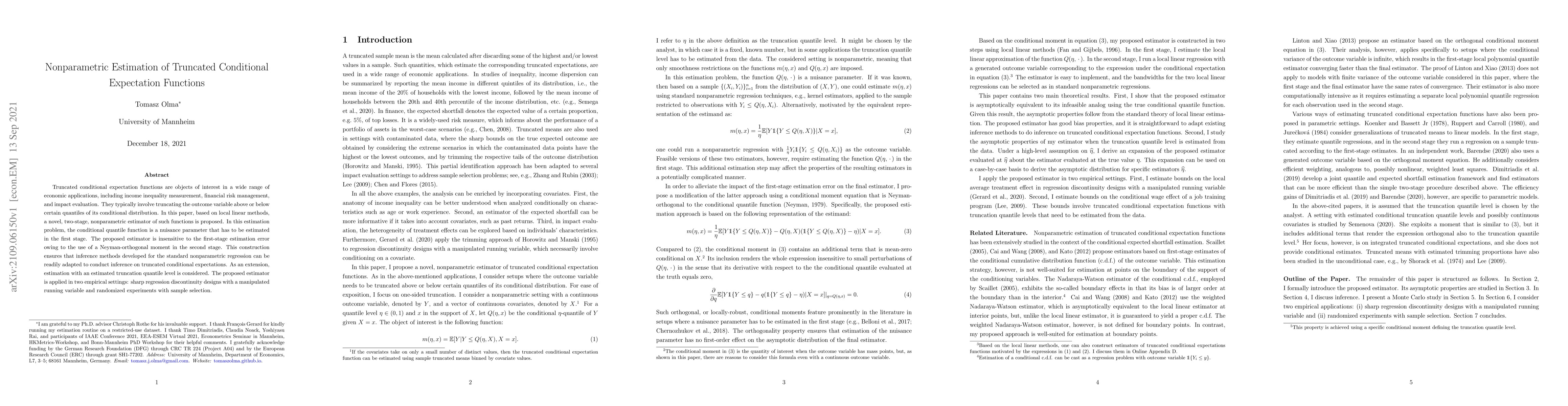 This paper proposes a two-stage nonparametric estimator for truncated conditional expectation functions using local linear methods, ensuring robustness to first-stage estimation errors. The method adapts standard nonparametric regression inference techniques and is applied in empirical settings involving regression discontinuity designs and randomized experiments with selection.