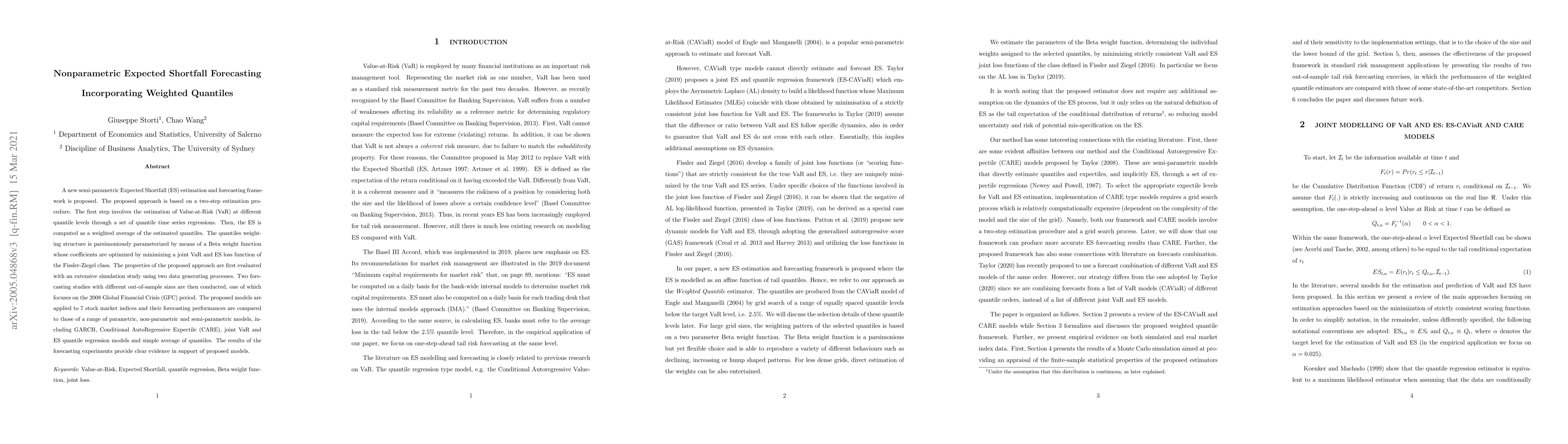 This paper proposes a semi-parametric framework for Expected Shortfall (ES) forecasting based on weighted quantiles. The approach estimates Value-at-Risk (VaR) via quantile regressions, computes ES as a weighted average of these quantiles, and optimizes weights using a Beta function. The model's performance is validated through simulations and out-of-sample forecasts, showing superior results compared to various benchmark models.