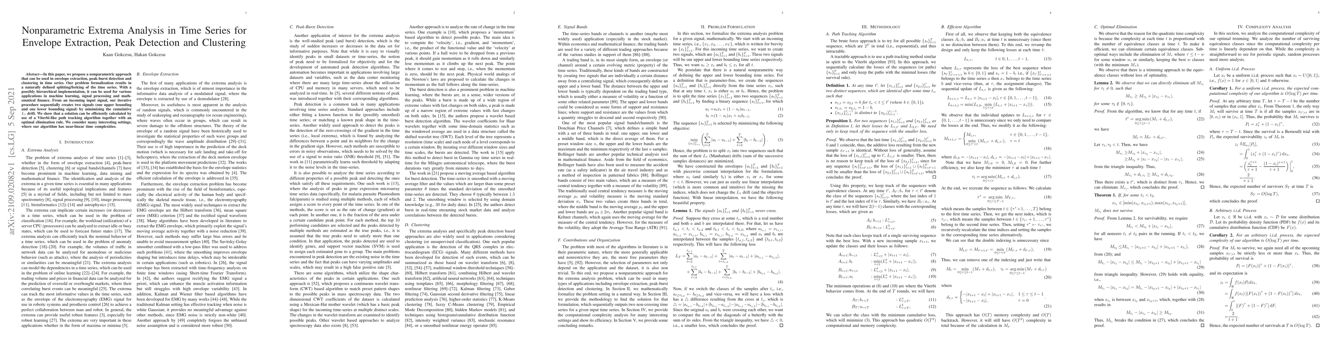 This paper proposes a nonparametric approach to extract envelopes, detect peaks, and cluster time series data, using an efficient algorithm with near-linear time complexities.