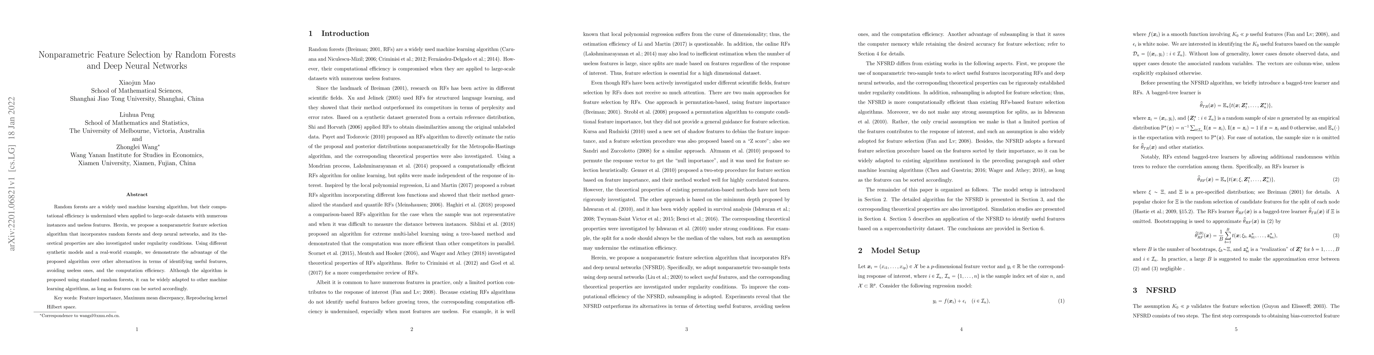The paper proposes a nonparametric feature selection algorithm, NFSRD, that integrates random forests and deep neural networks. It investigates the theoretical properties under regularity conditions using synthetic models and a real-world example.