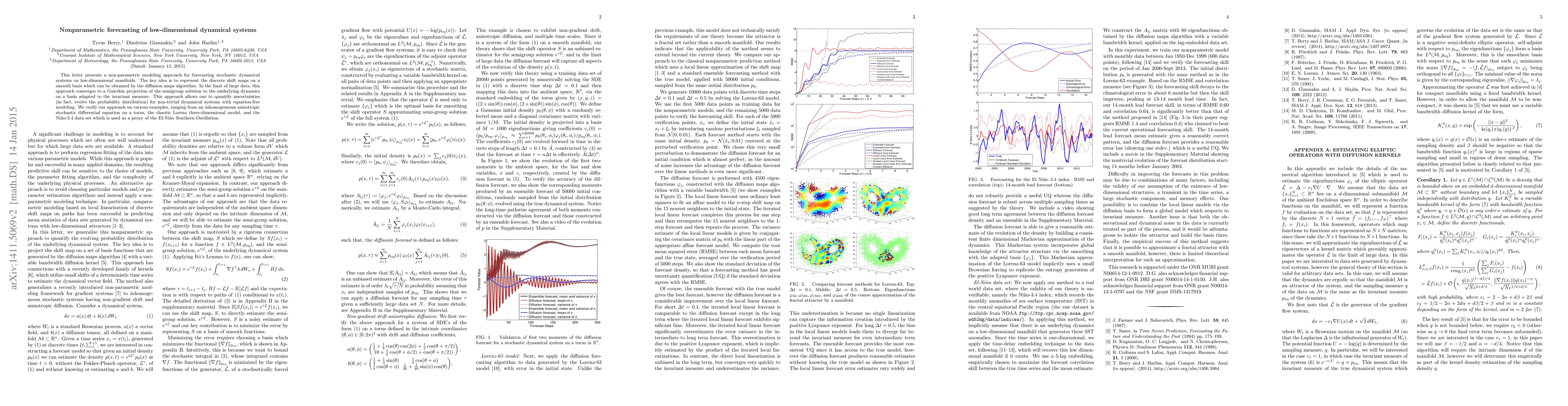 This paper introduces a non-parametric method for forecasting low-dimensional stochastic dynamical systems using diffusion maps, which converges to a Galerkin projection. The approach enables uncertainty quantification and equation-free modeling, demonstrated through examples like the Lorenz model and El Niño data.