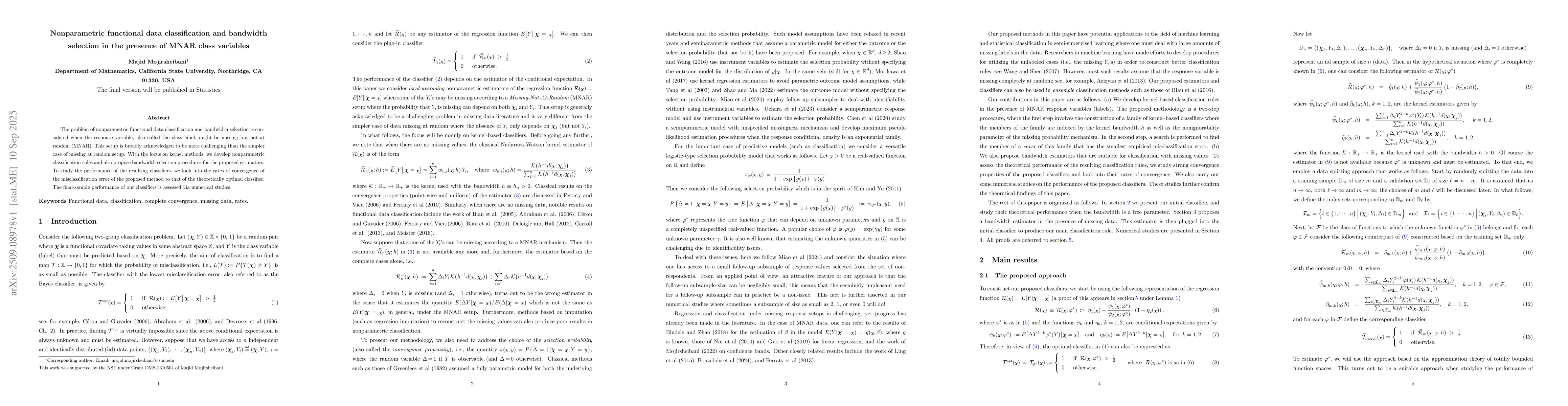 The problem of nonparametric functional data classification and bandwidth selection is considered when the response variable, also called the class label, might be missing but not at random (MNAR). This setup is broadly acknowledged to be more challenging than the simpler case of missing at random setup. With the focus on kernel methods, we develop nonparametric classification rules and also propose bandwidth selection procedures for the proposed estimators. To study the performance of the resulting classifiers, we look into the rates of convergence of the misclassification error of the proposed method to that of the theoretically optimal classifier. The final-sample performance of our classifiers is assessed via numerical studies.