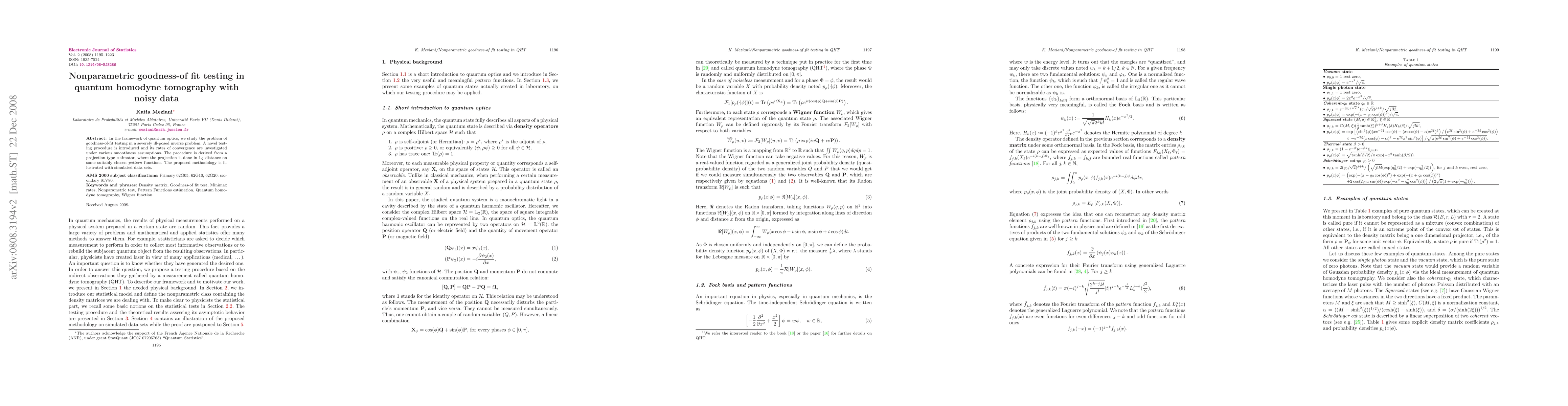 In the framework of quantum optics, we study the problem of goodness-of-fit testing in a severely ill-posed inverse problem. A novel testing procedure is introduced and its rates of convergence are investigated under various smoothness assumptions. The procedure is derived from a projection-type estimator, where the projection is done in $\mathbb{L}_2$ distance on some suitably chosen pattern functions. The proposed methodology is illustrated with simulated data sets.