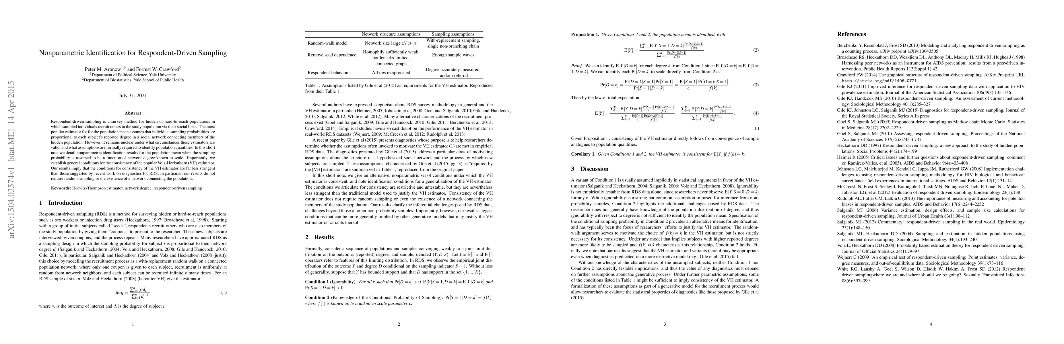 Respondent-driven sampling is a survey method for hidden or hard-to-reach populations in which sampled individuals recruit others in the study population via their social links. The most popular estimator for for the population mean assumes that individual sampling probabilities are proportional to each subject's reported degree in a social network connecting members of the hidden population. However, it remains unclear under what circumstances these estimators are valid, and what assumptions are formally required to identify population quantities. In this short note we detail nonparametric identification results for the population mean when the sampling probability is assumed to be a function of network degree known to scale. Importantly, we establish general conditions for the consistency of the popular Volz-Heckathorn (VH) estimator. Our results imply that the conditions for consistency of the VH estimator are far less stringent than those suggested by recent work on diagnostics for RDS. In particular, our results do not require random sampling or the existence of a network connecting the population.