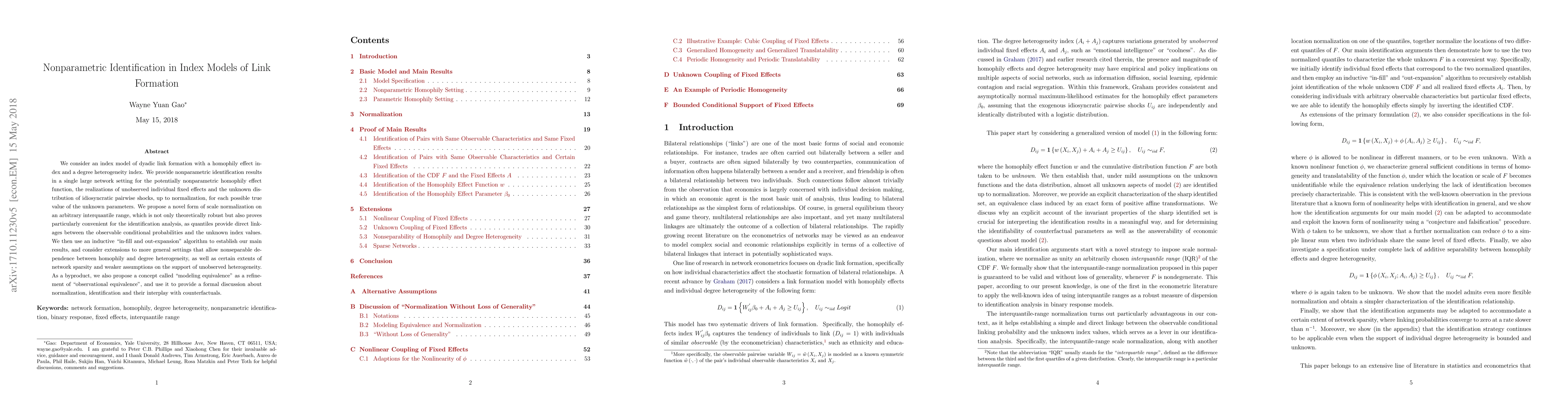 We consider an index model of dyadic link formation with a homophily effect index and a degree heterogeneity index. We provide nonparametric identification results in a single large network setting for the potentially nonparametric homophily effect function, the realizations of unobserved individual fixed effects and the unknown distribution of idiosyncratic pairwise shocks, up to normalization, for each possible true value of the unknown parameters. We propose a novel form of scale normalization on an arbitrary interquantile range, which is not only theoretically robust but also proves particularly convenient for the identification analysis, as quantiles provide direct linkages between the observable conditional probabilities and the unknown index values. We then use an inductive "in-fill and out-expansion" algorithm to establish our main results, and consider extensions to more general settings that allow nonseparable dependence between homophily and degree heterogeneity, as well as certain extents of network sparsity and weaker assumptions on the support of unobserved heterogeneity. As a byproduct, we also propose a concept called "modeling equivalence" as a refinement of "observational equivalence", and use it to provide a formal discussion about normalization, identification and their interplay with counterfactuals.