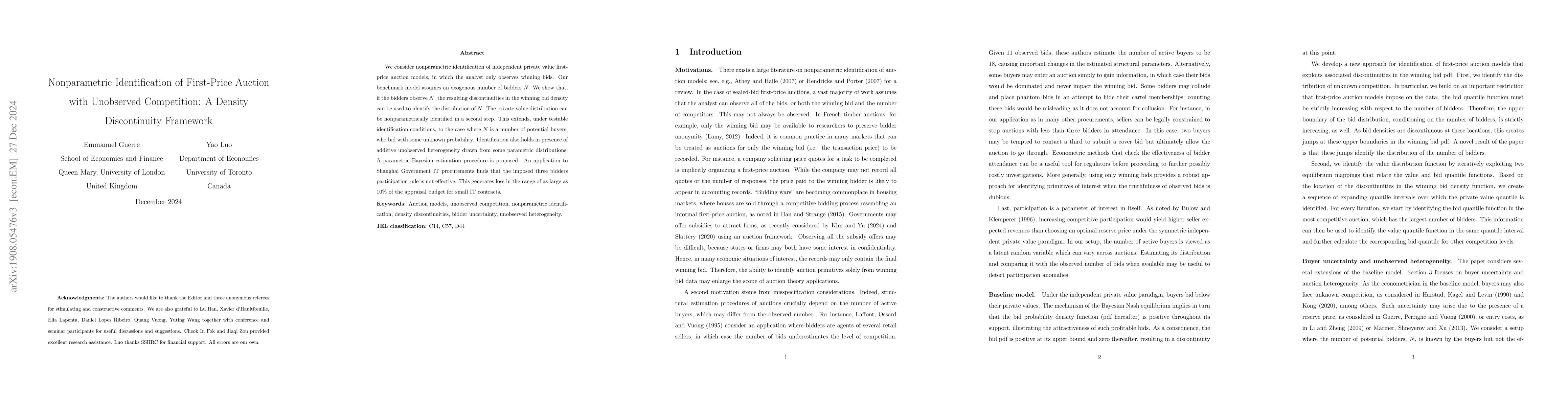 We consider nonparametric identification of independent private value first-price auction models, in which the analyst only observes winning bids. Our benchmark model assumes an exogenous number of bidders N. We show that, if the bidders observe N, the resulting discontinuities in the winning bid density can be used to identify the distribution of N. The private value distribution can be nonparametrically identified in a second step. This extends, under testable identification conditions, to the case where N is a number of potential buyers, who bid with some unknown probability. Identification also holds in presence of additive unobserved heterogeneity drawn from some parametric distributions. A last class of extensions deals with cartels which can change size across auctions due to varying bidder cartel membership. Identification still holds if the econometrician observes winner identities and winning bids, provided a (unknown) bidder is always a cartel member. The cartel participation probabilities of other bidders can also be identified. An application to USFS timber auction data illustrates the usefulness of discontinuities to analyze bidder participation.