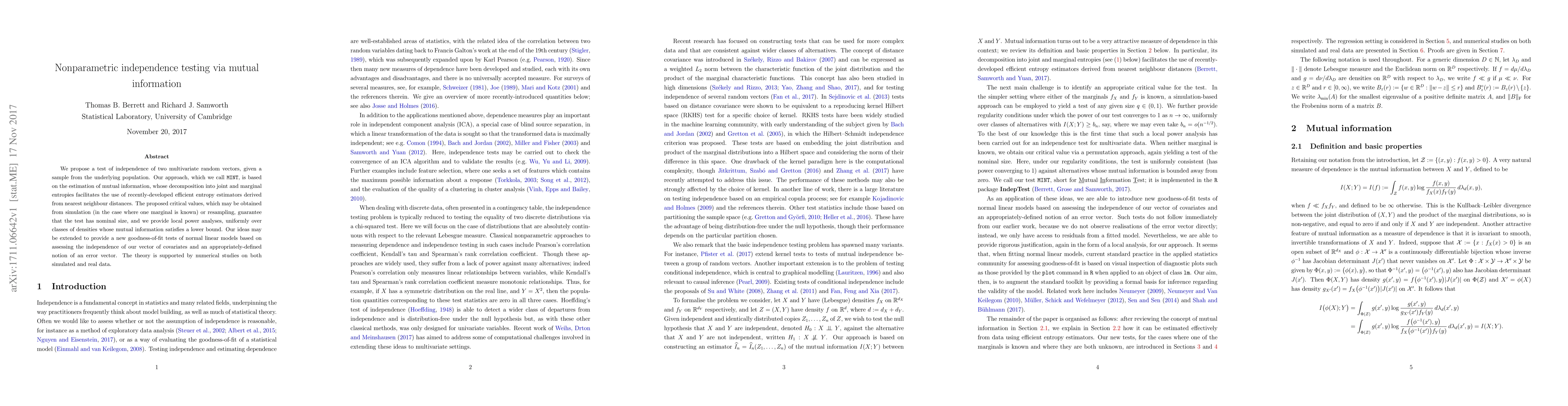 We propose a test of independence of two multivariate random vectors, given a sample from the underlying population. Our approach, which we call MINT, is based on the estimation of mutual information, whose decomposition into joint and marginal entropies facilitates the use of recently-developed efficient entropy estimators derived from nearest neighbour distances. The proposed critical values, which may be obtained from simulation (in the case where one marginal is known) or resampling, guarantee that the test has nominal size, and we provide local power analyses, uniformly over classes of densities whose mutual information satisfies a lower bound. Our ideas may be extended to provide a new goodness-of-fit tests of normal linear models based on assessing the independence of our vector of covariates and an appropriately-defined notion of an error vector. The theory is supported by numerical studies on both simulated and real data.