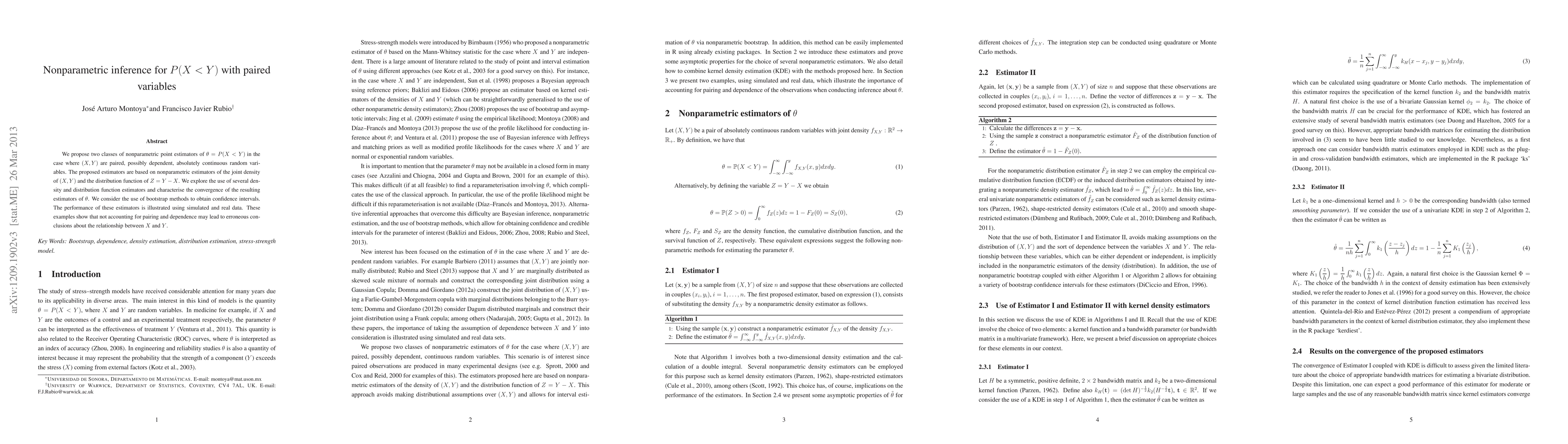 This paper proposes nonparametric estimators for $P(X<Y)$ in paired, possibly dependent random variables $(X,Y)$ and examines their convergence. It explores various density and distribution function estimators and uses bootstrap methods for confidence intervals, demonstrating the importance of accounting for pairing and dependence through simulated and real data examples.