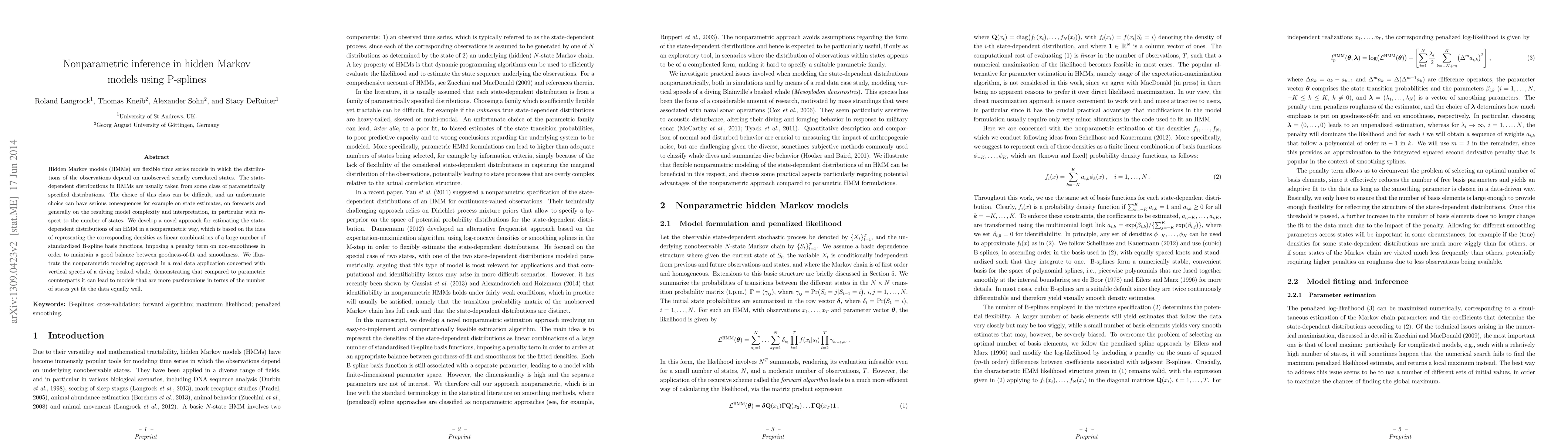 Hidden Markov models (HMMs) are flexible time series models in which the distributions of the observations depend on unobserved serially correlated states. The state-dependent distributions in HMMs are usually taken from some class of parametrically specified distributions. The choice of this class can be difficult, and an unfortunate choice can have serious consequences for example on state estimates, on forecasts and generally on the resulting model complexity and interpretation, in particular with respect to the number of states. We develop a novel approach for estimating the state-dependent distributions of an HMM in a nonparametric way, which is based on the idea of representing the corresponding densities as linear combinations of a large number of standardized B-spline basis functions, imposing a penalty term on non-smoothness in order to maintain a good balance between goodness-of-fit and smoothness. We illustrate the nonparametric modeling approach in a real data application concerned with vertical speeds of a diving beaked whale, demonstrating that compared to parametric counterparts it can lead to models that are more parsimonious in terms of the number of states yet fit the data equally well.