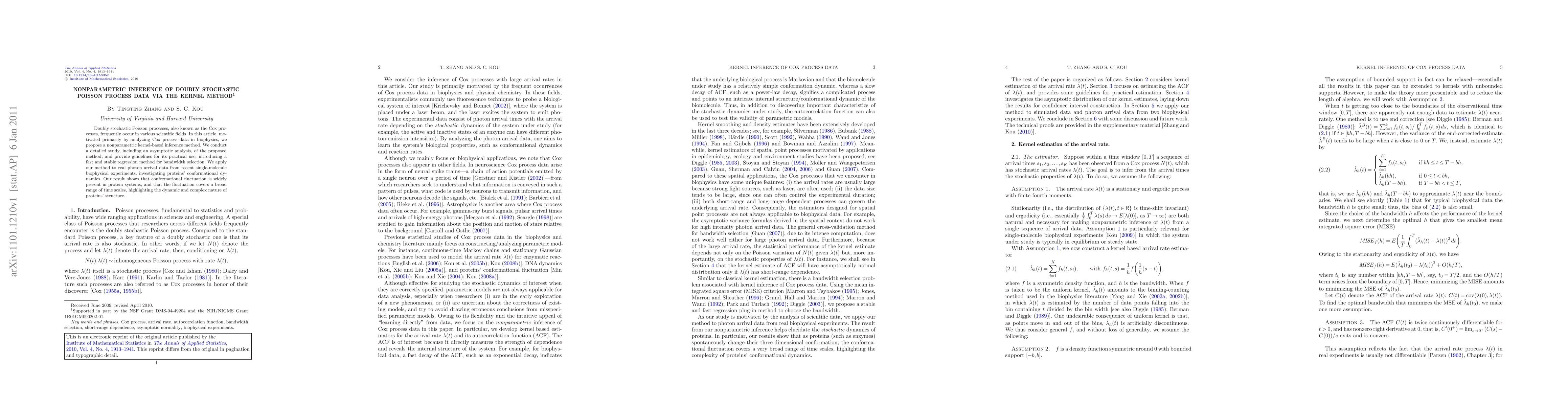 This paper proposes a nonparametric kernel-based inference method for doubly stochastic Poisson processes, or Cox processes, with applications in biophysics. The method includes a fast and stable regression technique for bandwidth selection and is demonstrated through analysis of real photon arrival data, revealing widespread conformational fluctuations in protein systems across various time scales.