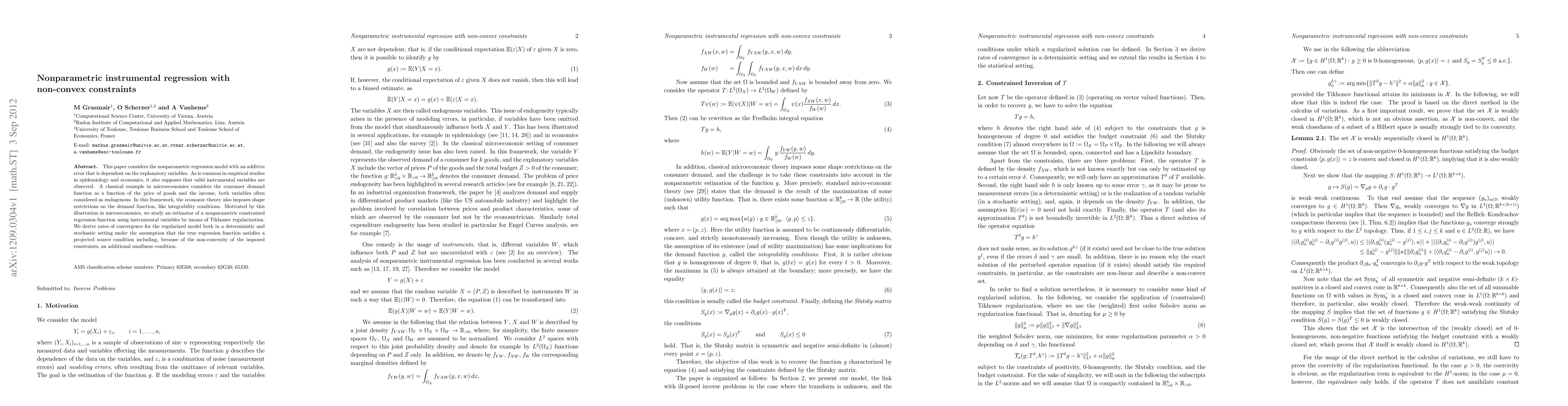 This paper develops a nonparametric instrumental regression estimator under non-convex constraints using Tikhonov regularization, focusing on applications in epidemiology and economics where endogenous variables and shape restrictions are present. It provides convergence rates for the estimator in both deterministic and stochastic settings.