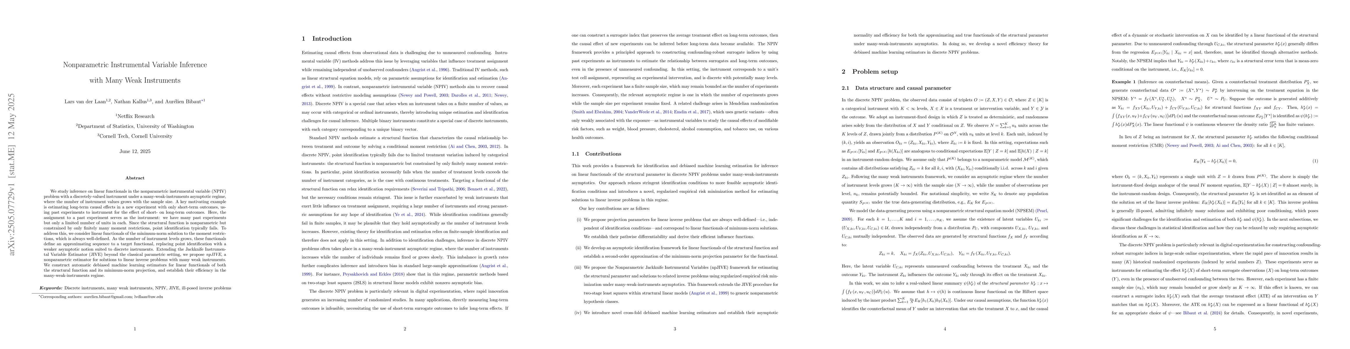 We study inference on linear functionals in the nonparametric instrumental variable (NPIV) problem with a discretely-valued instrument under a many-weak-instruments asymptotic regime, where the number of instrument values grows with the sample size. A key motivating example is estimating long-term causal effects in a new experiment with only short-term outcomes, using past experiments to instrument for the effect of short- on long-term outcomes. Here, the assignment to a past experiment serves as the instrument: we have many past experiments but only a limited number of units in each. Since the structural function is nonparametric but constrained by only finitely many moment restrictions, point identification typically fails. To address this, we consider linear functionals of the minimum-norm solution to the moment restrictions, which is always well-defined. As the number of instrument levels grows, these functionals define an approximating sequence to a target functional, replacing point identification with a weaker asymptotic notion suited to discrete instruments. Extending the Jackknife Instrumental Variable Estimator (JIVE) beyond the classical parametric setting, we propose npJIVE, a nonparametric estimator for solutions to linear inverse problems with many weak instruments. We construct automatic debiased machine learning estimators for linear functionals of both the structural function and its minimum-norm projection, and establish their efficiency in the many-weak-instruments regime.