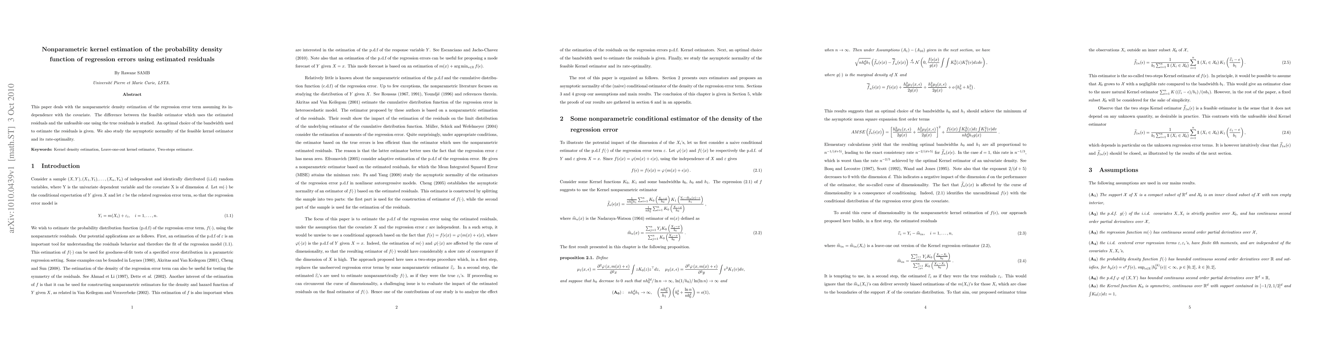 This paper proposes a nonparametric kernel estimator for the probability density function of regression errors using estimated residuals, comparing it with the ideal estimator using true residuals. It also discusses optimal bandwidth selection and proves the asymptotic normality and rate-optimality of the proposed estimator.