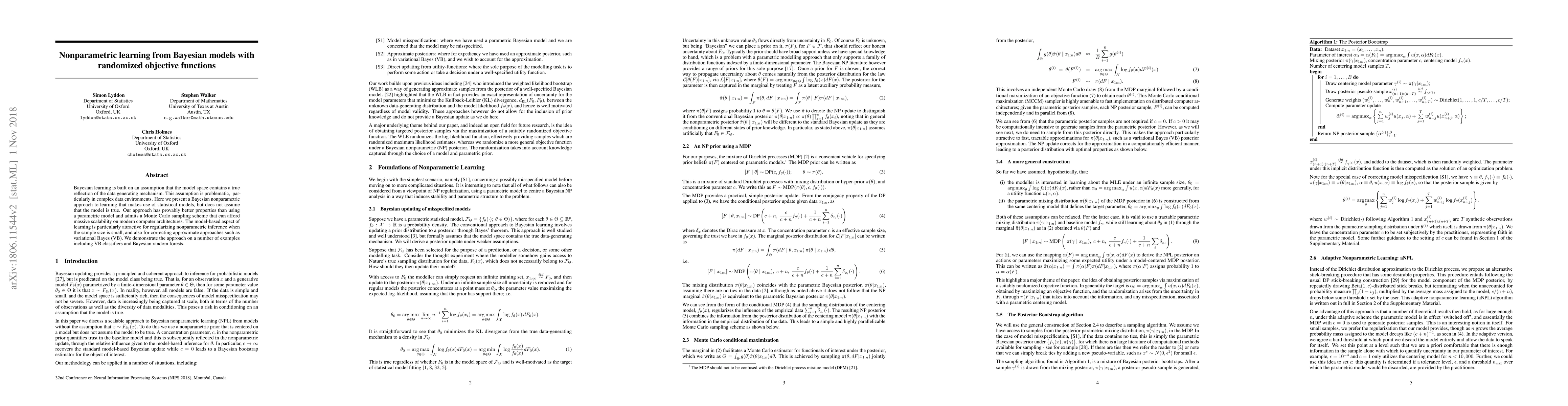 This paper proposes a Bayesian nonparametric learning method that leverages statistical models without assuming they are true, improving scalability and regularization, especially for small sample sizes. It demonstrates better performance than parametric models and applies to variational Bayes classifiers and Bayesian random forests.