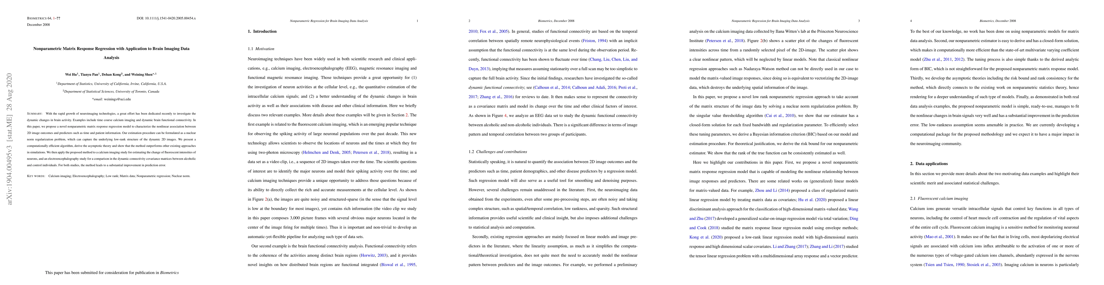 This paper introduces a novel nonparametric matrix response regression model to analyze nonlinear associations in dynamic brain imaging data, employing nuclear norm regularization to capture low-rank structures. The proposed method is shown to outperform existing approaches in simulations and is applied to calcium imaging and electroencephalography studies, demonstrating significant improvements in prediction accuracy.