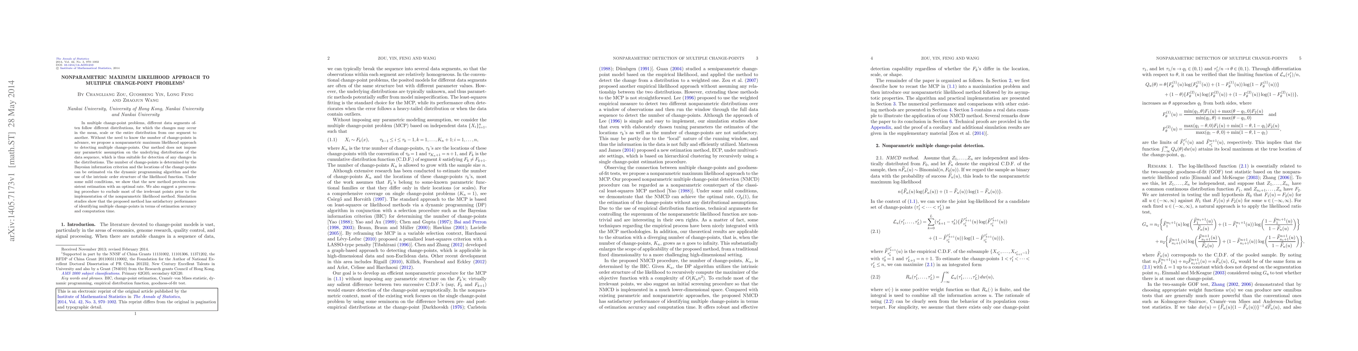 This paper proposes a nonparametric maximum likelihood approach for detecting multiple change-points in data segments that may follow different distributions. The method determines the number of change-points using Bayesian information criterion and estimates their locations via dynamic programming, showing consistent estimation with optimal rates.