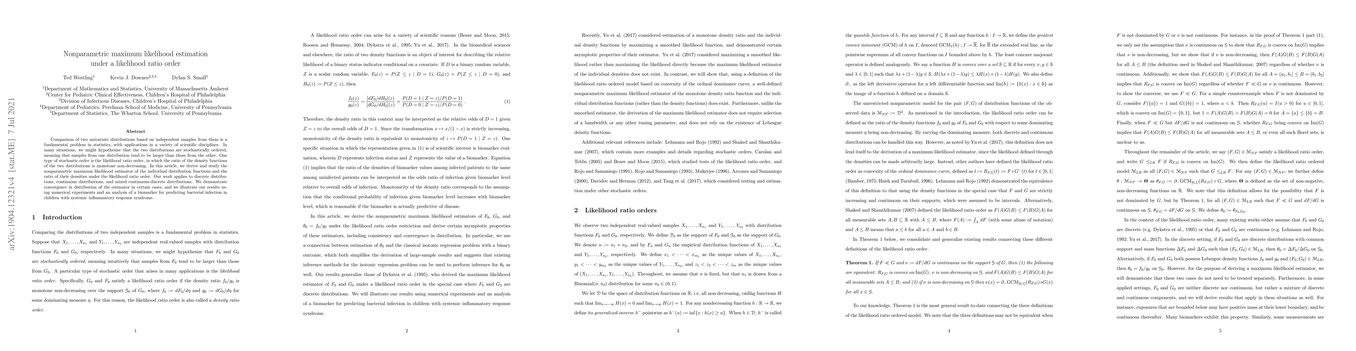 This paper develops nonparametric maximum likelihood estimators for comparing two univariate distributions under the likelihood ratio order, applicable to discrete, continuous, and mixed distributions. The authors demonstrate the estimator's convergence and validate it through numerical experiments and a case study on biomarker prediction for bacterial infection.