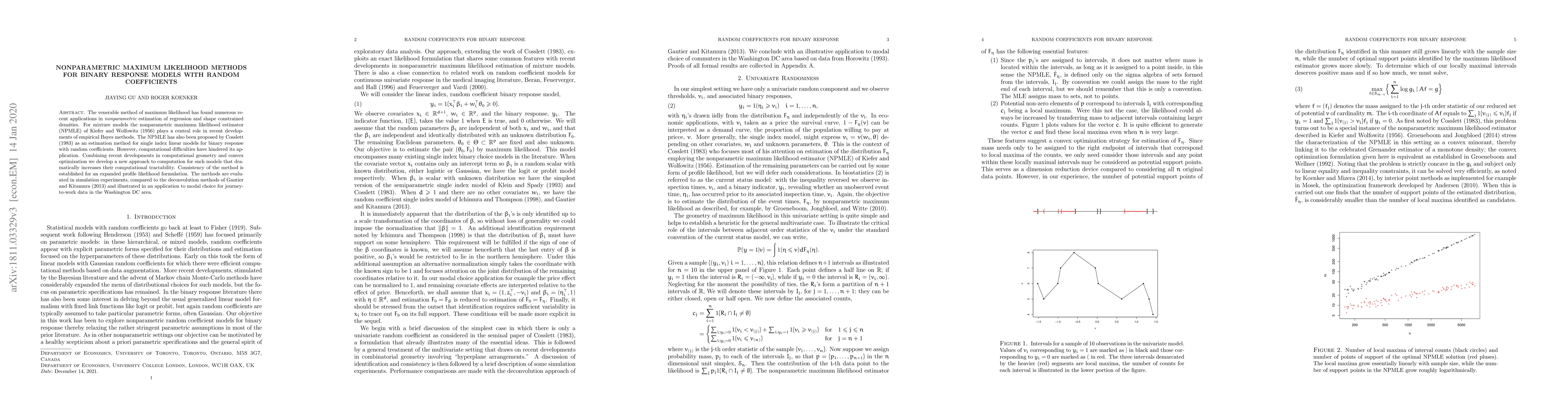 New nonparametric maximum likelihood methods for binary response models with random coefficients have improved computational tractability, enabling greater flexibility in applications such as modal choice modeling.